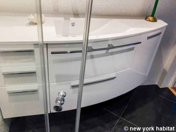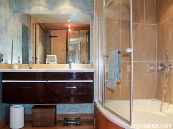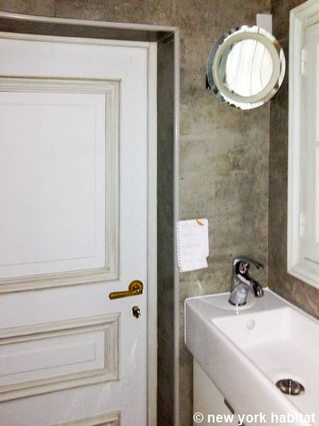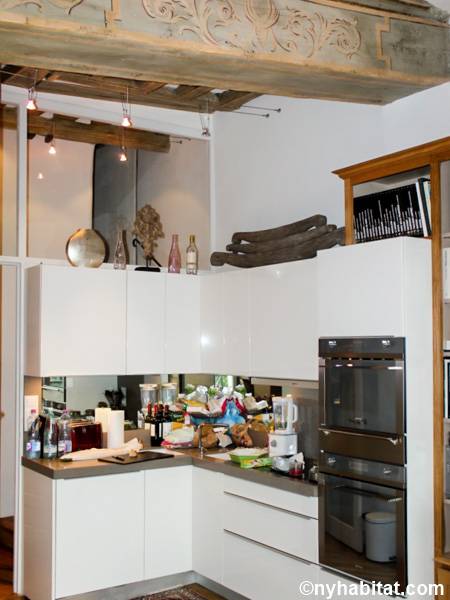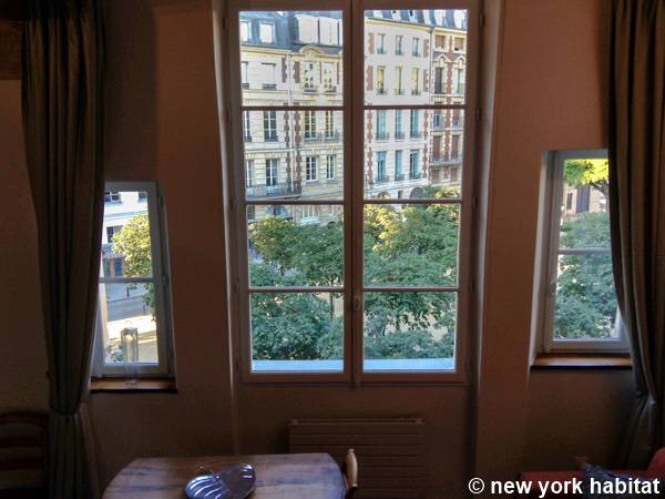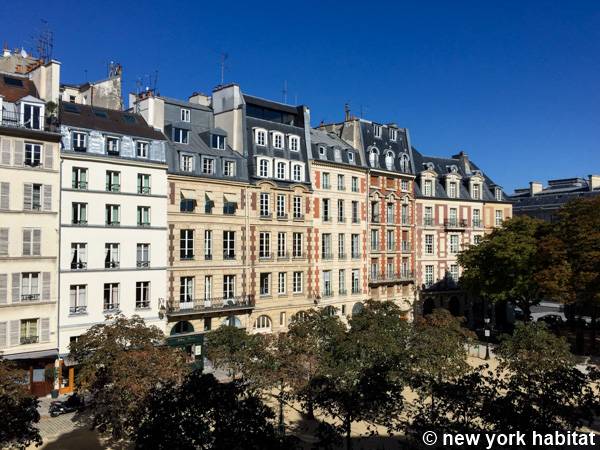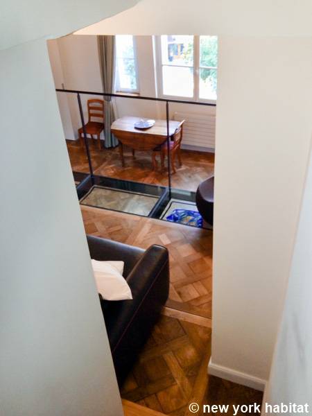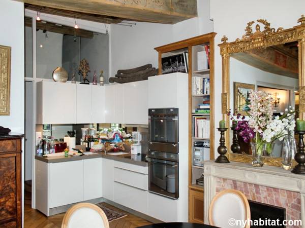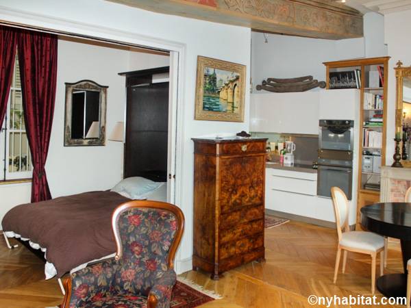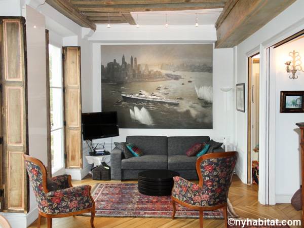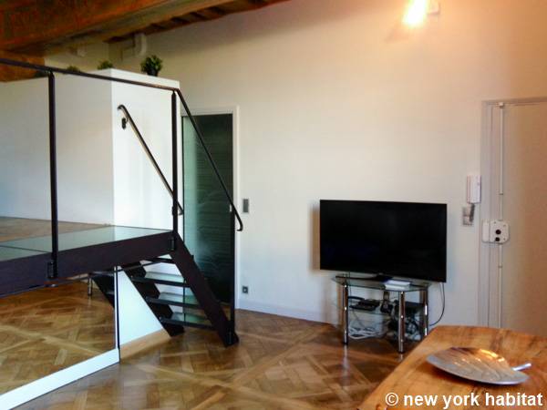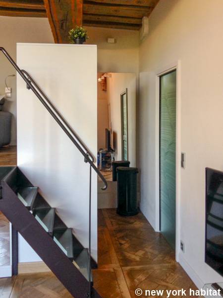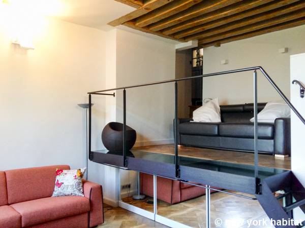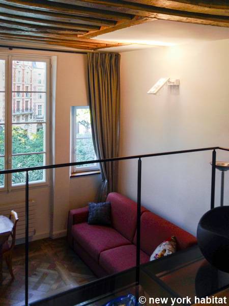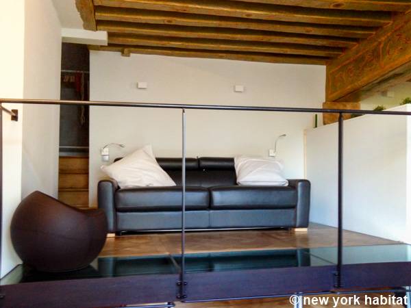 Connected by a staircase to bedroom 2 is the second half of the apartment, facing Place Dauphine. It is composed of a sleeping mezzanine with a queen sofa bed, a living room area with another queen sofa bed and a second cable TV. A kitchenette is around the corner and a full bathroom is available in the unit.