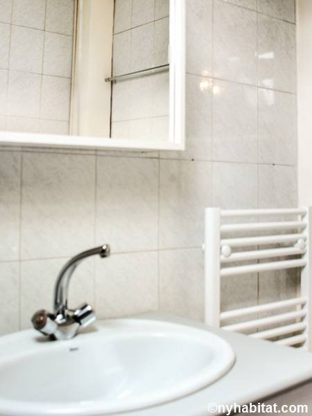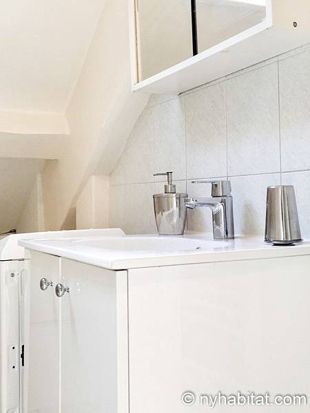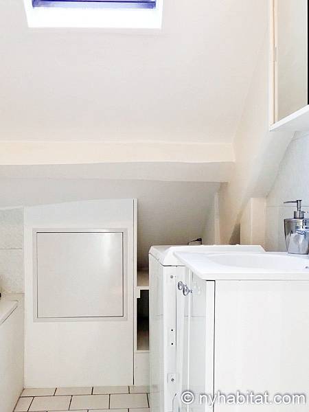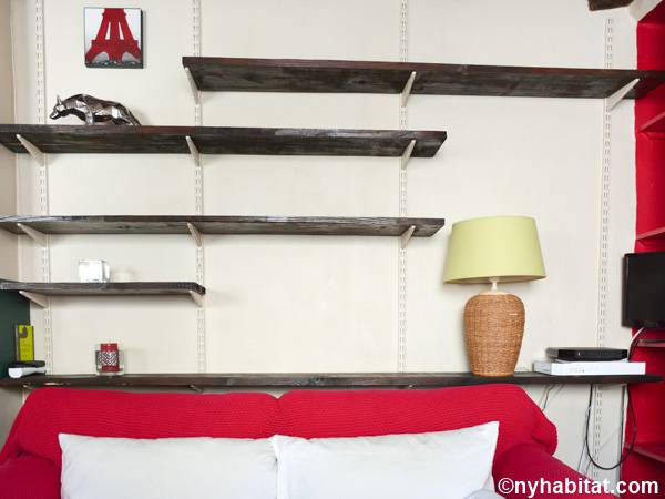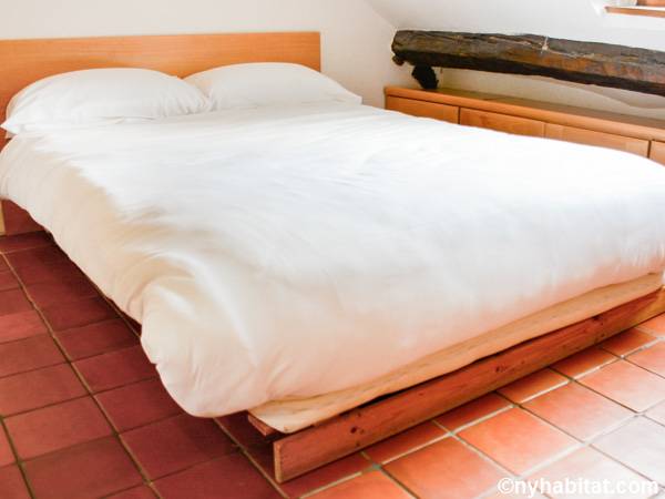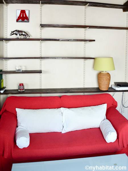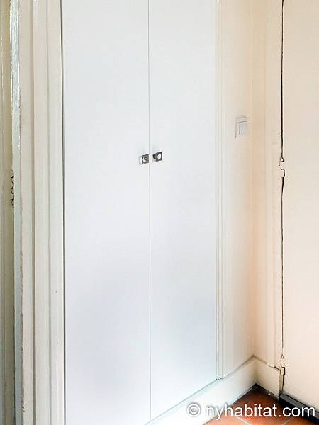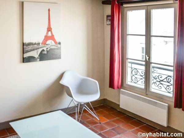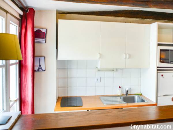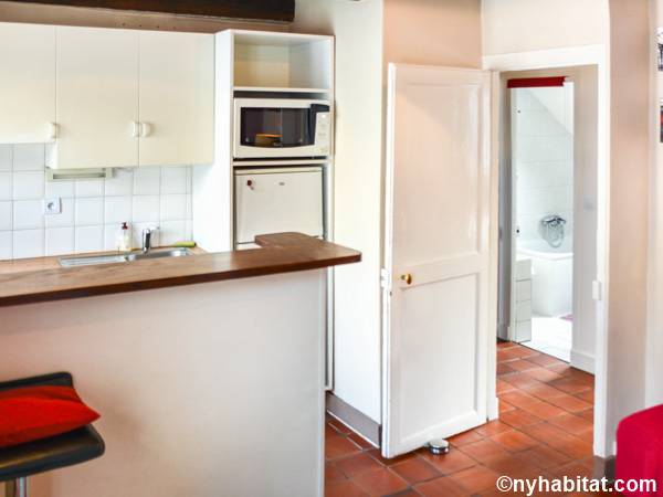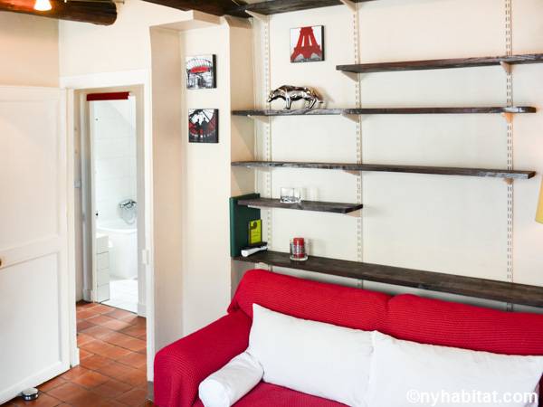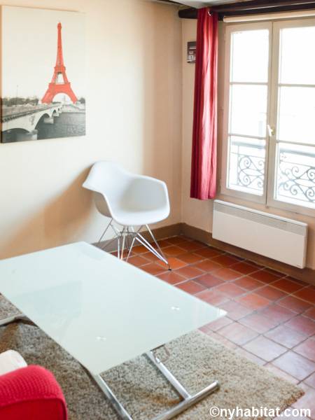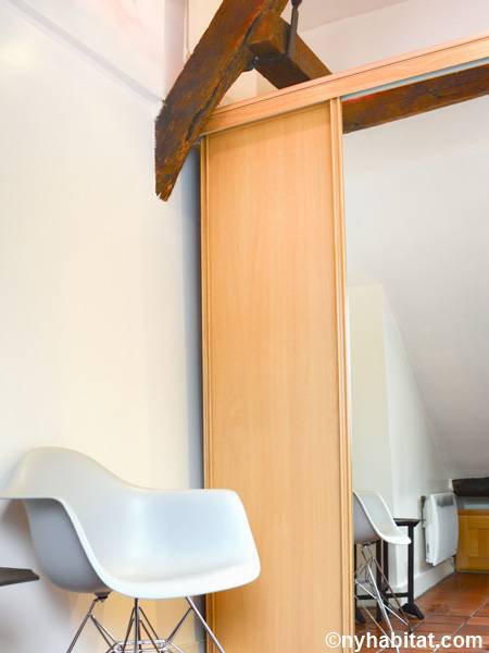 Exposed wooden beams, original terra cotta floors, white tile in the bathroom and kitchen, French windows and plenty of wood shelves in the living room make this 38 m2 (approx. 409 sq. ft.) apartment in the Madeleine region of Paris a perfect place to rest after you’ve explored all of the crevices of the city of lights. You’ll love bathing in the bathtub, a true luxury in Paris where standing shower stalls are the norm. The American kitchen and living space is separated from the bathroom and bedroom. You’ll be able to prepare delicious meals with all of the fresh produce you’ve procured from the markets. Dinner guests can sip on drinks and munch on appetizers while swirling on the stools at the bar. The kitchen has many great features. You will find a microwave oven combo, dishwasher, a toaster and blender, all of the materials necessary to make tea and coffee, and best of all, a champagne service set as well as a fondue set both of which are excellent for entertaining. Easy to clean electric stovetops and a laundry machine are also a plus. Enjoy the full sized bed in the bedroom. You’ll have room to store your belongings in the built in drawers that pull out from the wall. This is an optimal use of the space adding functional charm to the so Parisian slanted ceilings in the bedroom.