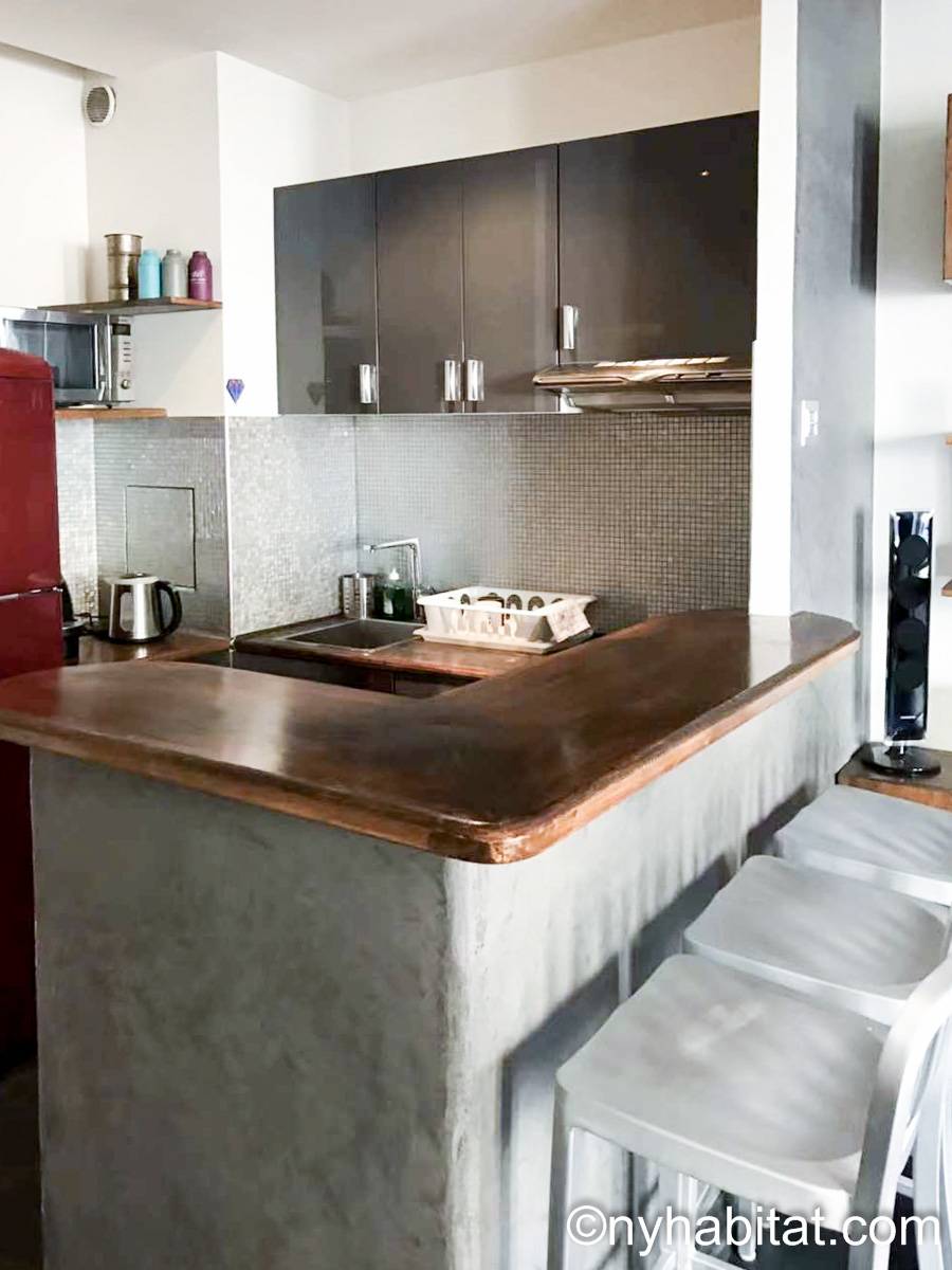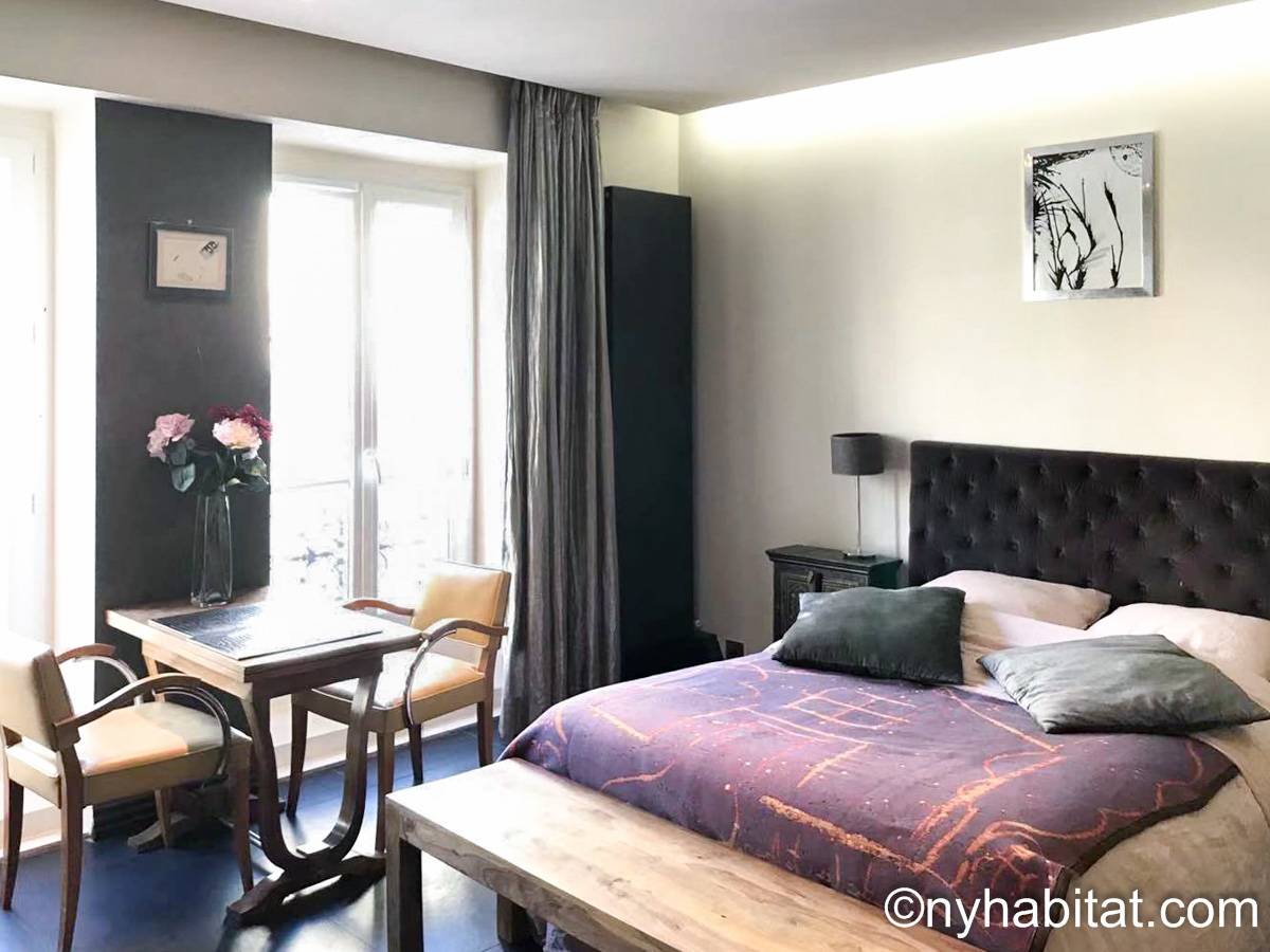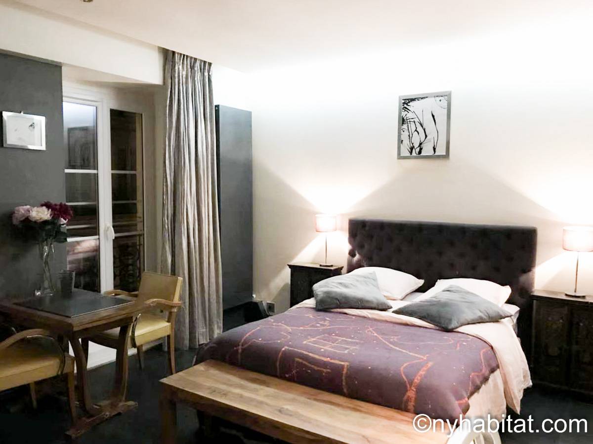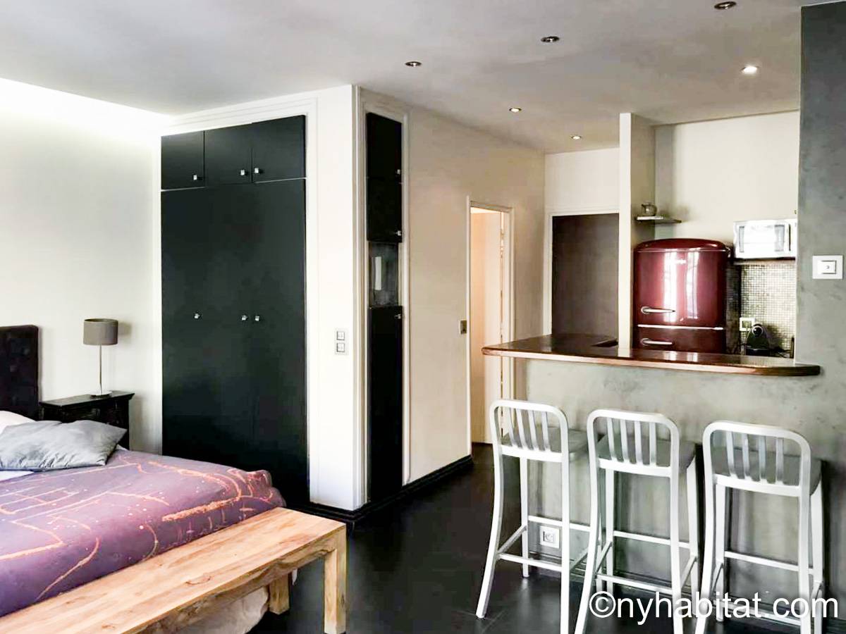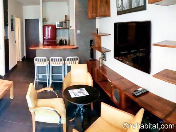 This contemporary and functional 3rd Floor (4th floor in the United States) Les Halles Studio Apartment in the 3rd arrondissement of Paris (3rd District) is conveniently located near all one needs for a comfortable lifestyle. The Studio Les Halles Paris Apartment with 1 Bath is cleverly designed with its fusion between rest, entertainment, and dining. Across from the queen-sized, a wall-mounted flat screen TV keeps one connected and there are several shelves that complete the media center. The modern open kitchen is covered in stainless steel motivating food preparation. The bar and stool eating area bring the dining-out atmosphere when eating in and hosting a gathering. In the bathroom, find glass door shower and soaking tub. All of the features found make this a cozy, cool, and comfortable residence.
