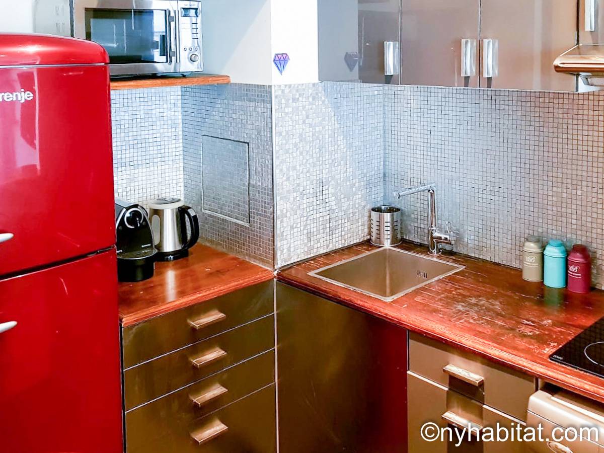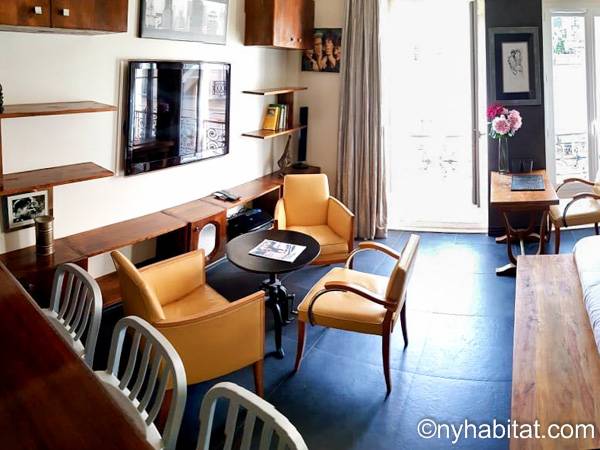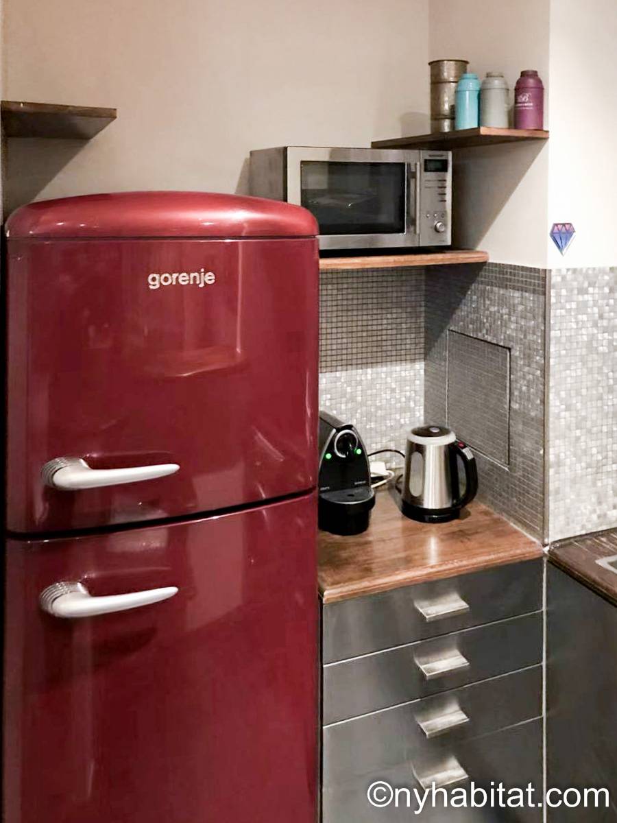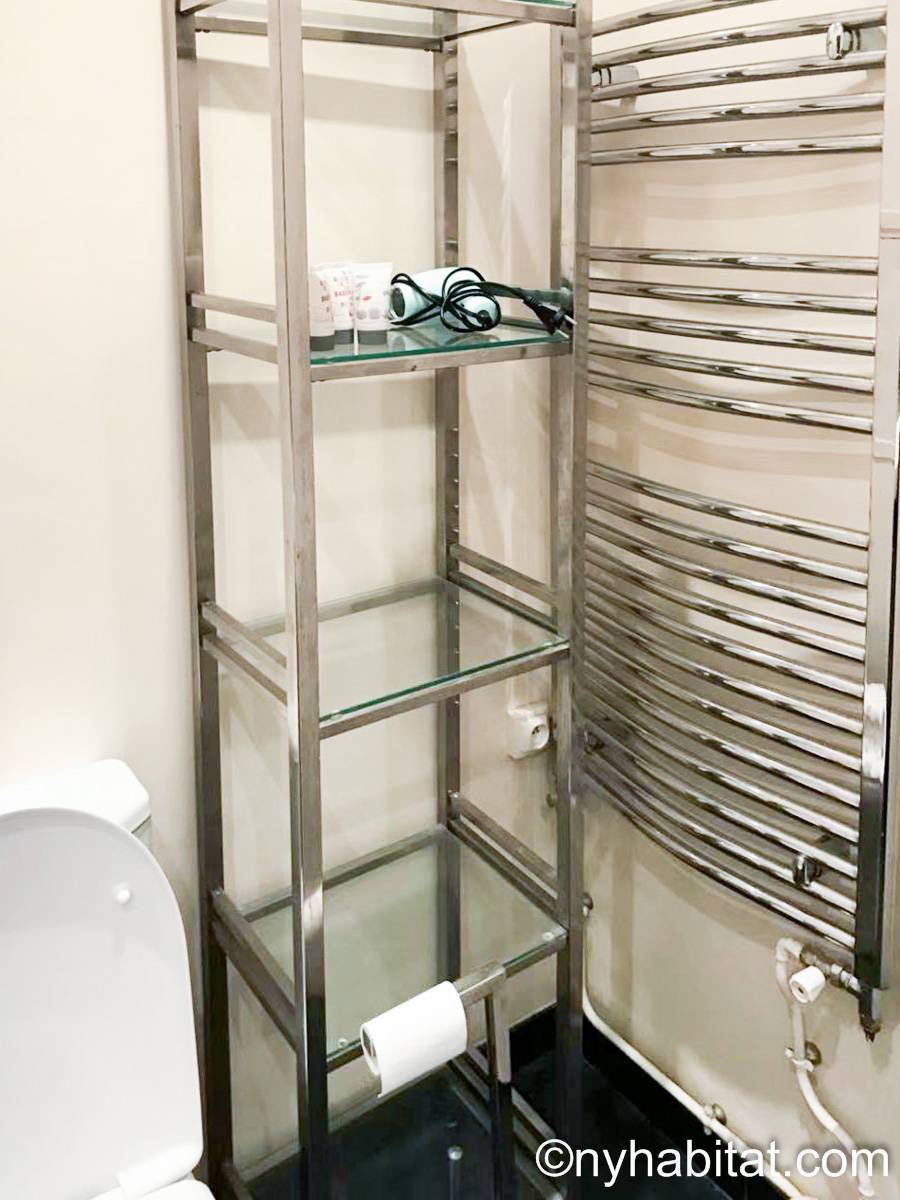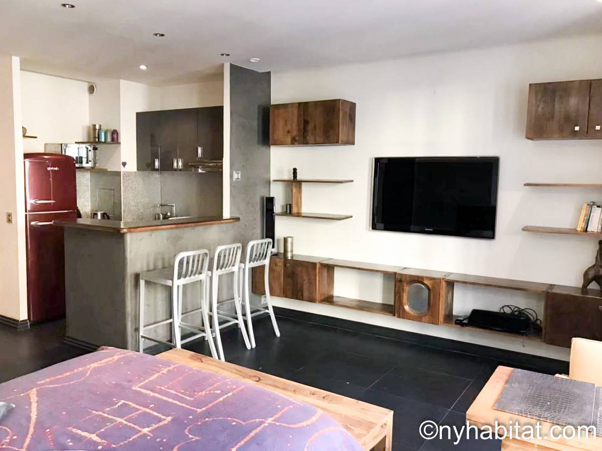 This contemporary and functional 3rd Floor (4th floor in the United States) Les Halles Studio Apartment in the 3rd arrondissement of Paris (3rd District) is conveniently located near all one needs for a comfortable lifestyle. The Studio Les Halles Paris Apartment with 1 Bath is cleverly designed with its fusion between rest, entertainment, and dining. Across from the queen-sized, a wall-mounted flat screen TV keeps one connected and there are several shelves that complete the media center. The modern open kitchen is covered in stainless steel motivating food preparation. The bar and stool eating area bring the dining-out atmosphere when eating in and hosting a gathering. In the bathroom, find glass door shower and soaking tub. All of the features found make this a cozy, cool, and comfortable residence.