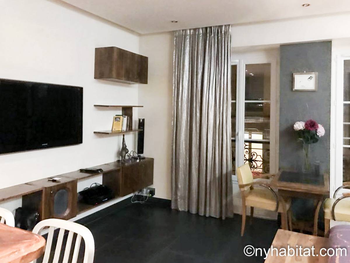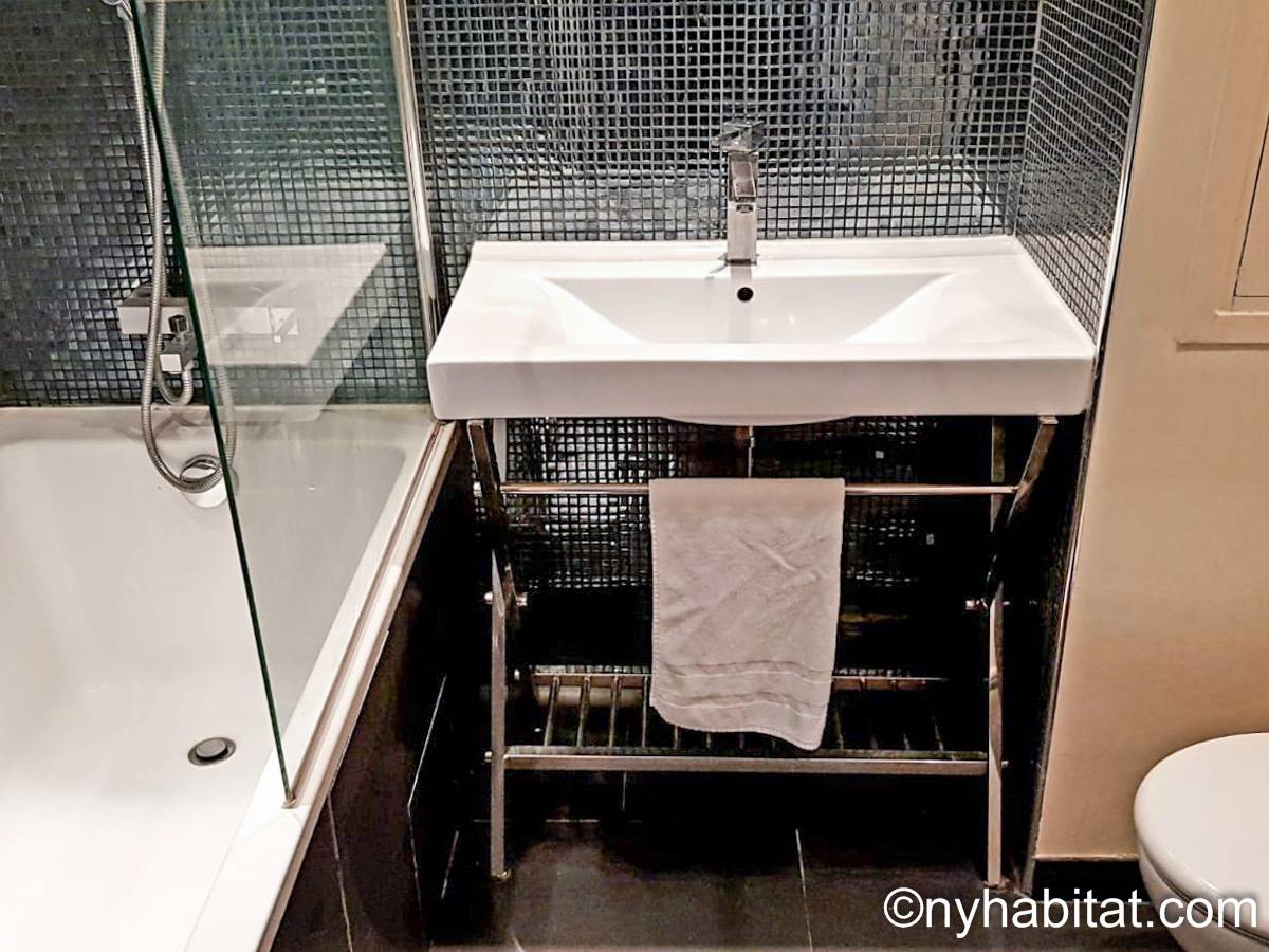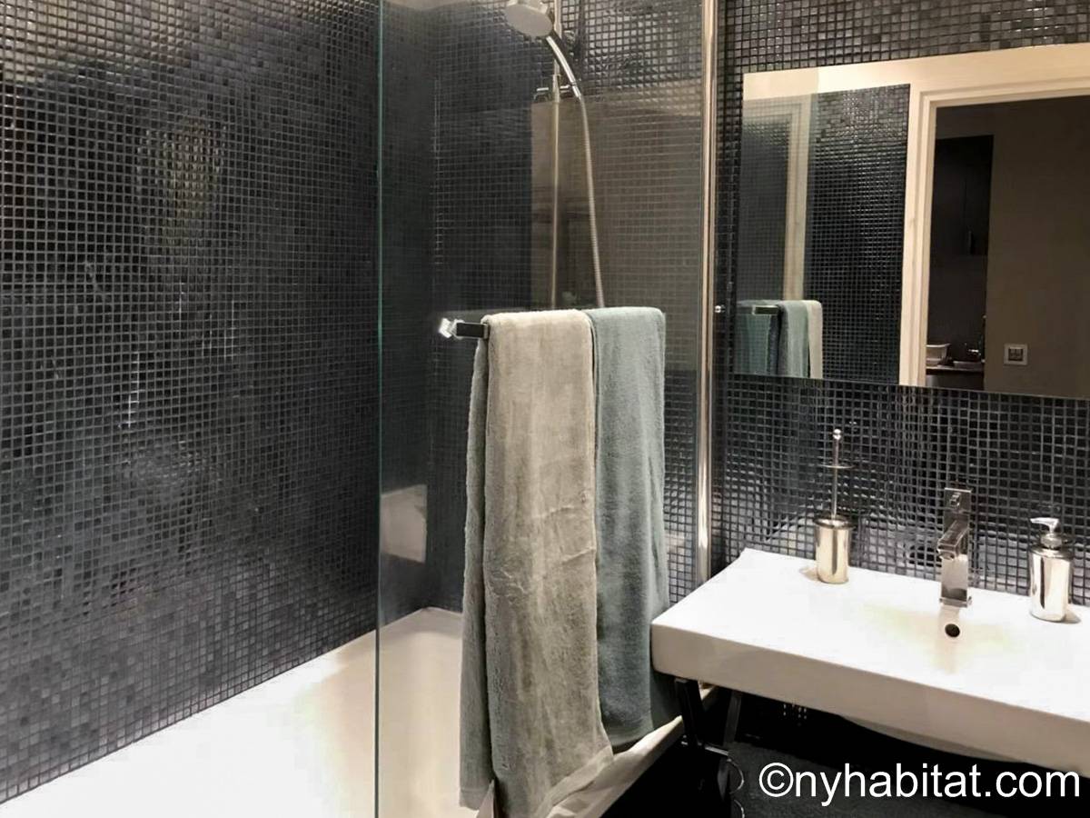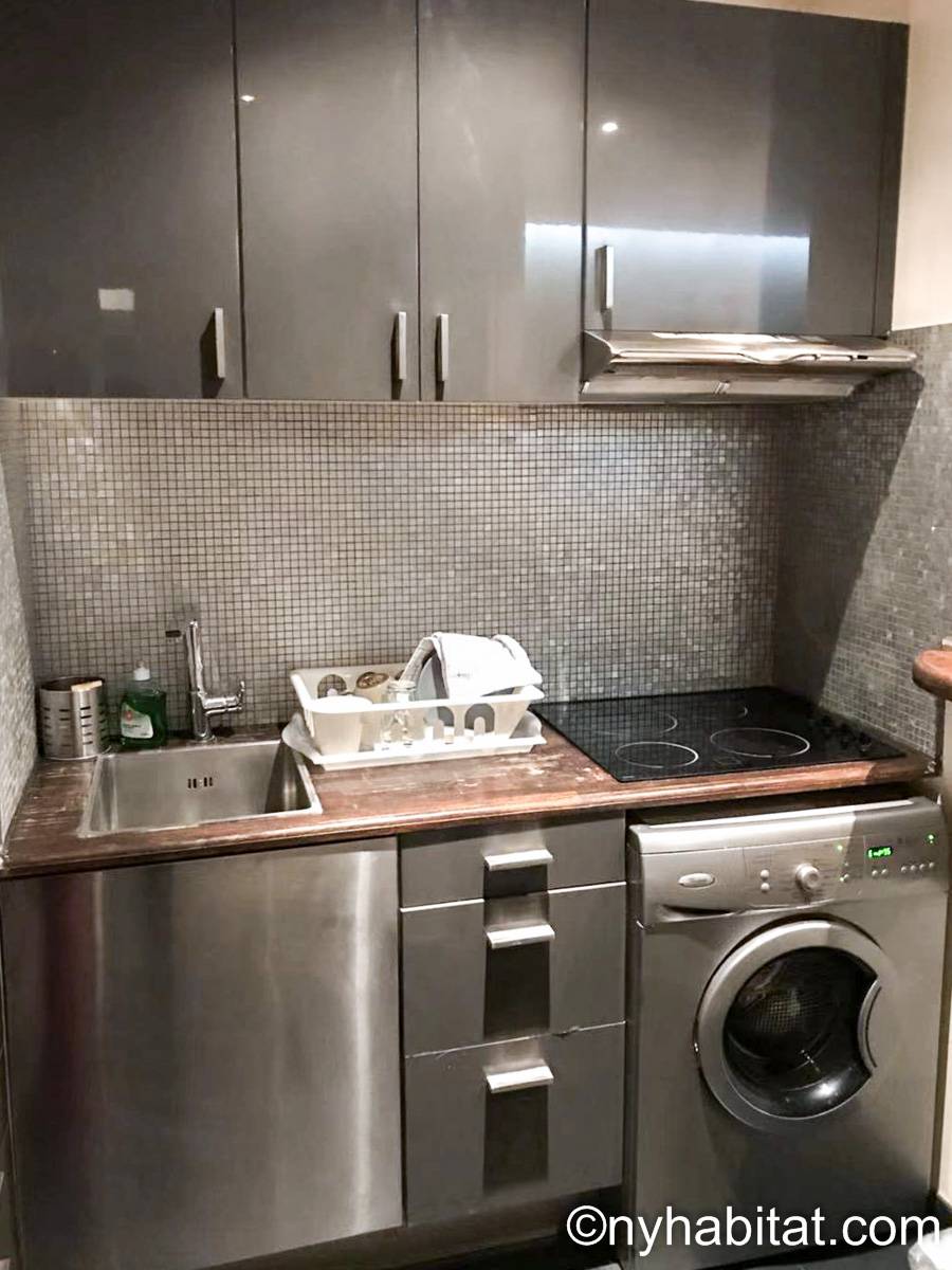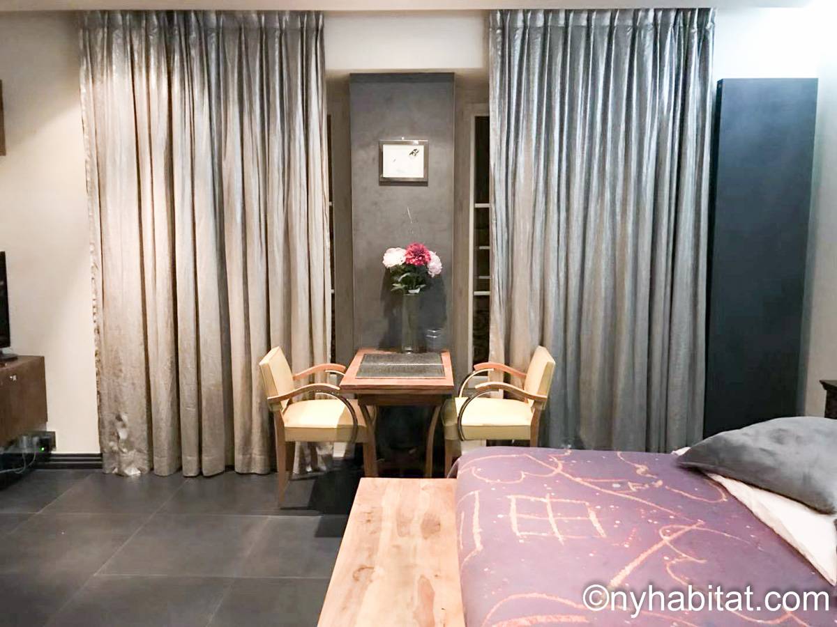 This contemporary and functional 3rd Floor (4th floor in the United States) Les Halles Studio Apartment in the 3rd arrondissement of Paris (3rd District) is conveniently located near all one needs for a comfortable lifestyle. The Studio Les Halles Paris Apartment with 1 Bath is cleverly designed with its fusion between rest, entertainment, and dining. Across from the queen-sized, a wall-mounted flat screen TV keeps one connected and there are several shelves that complete the media center. The modern open kitchen is covered in stainless steel motivating food preparation. The bar and stool eating area bring the dining-out atmosphere when eating in and hosting a gathering. In the bathroom, find glass door shower and soaking tub. All of the features found make this a cozy, cool, and comfortable residence.