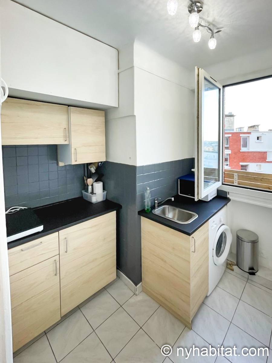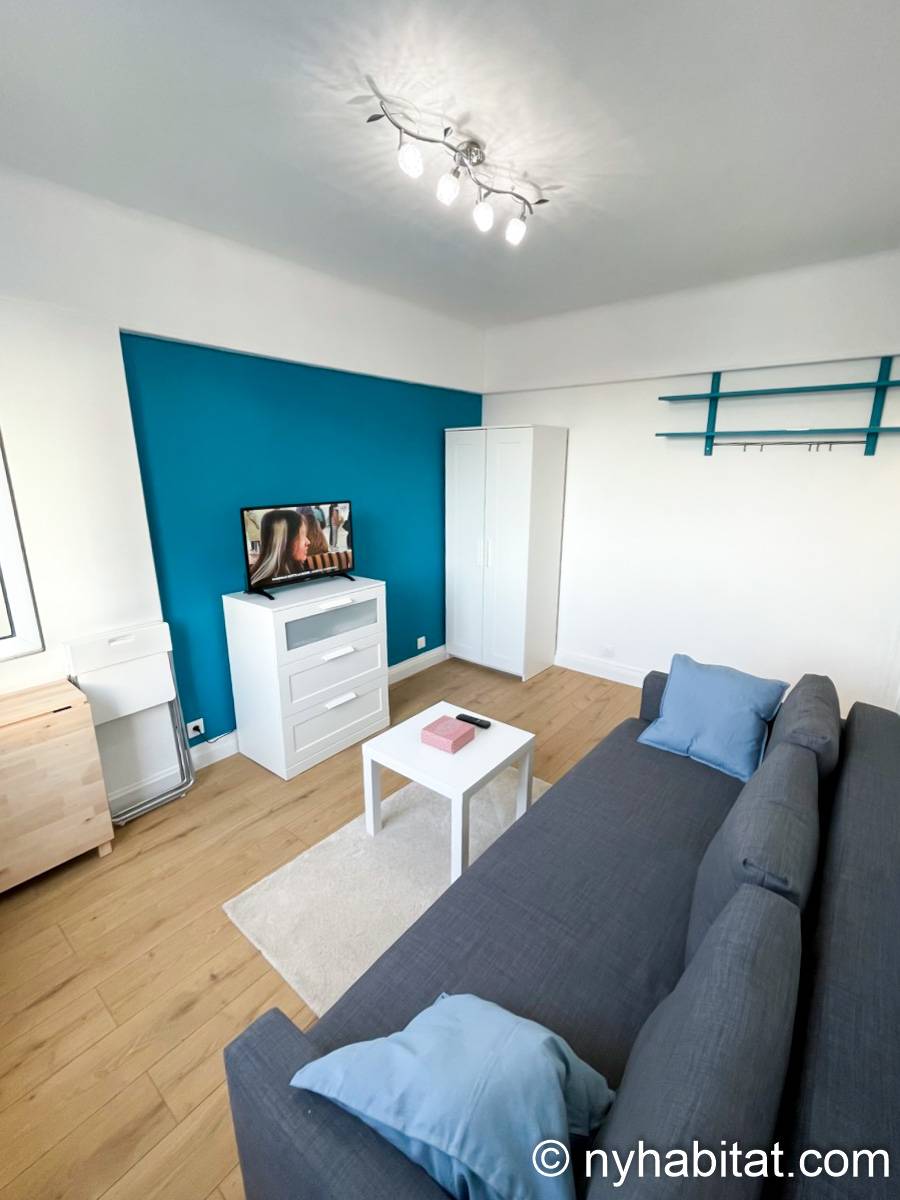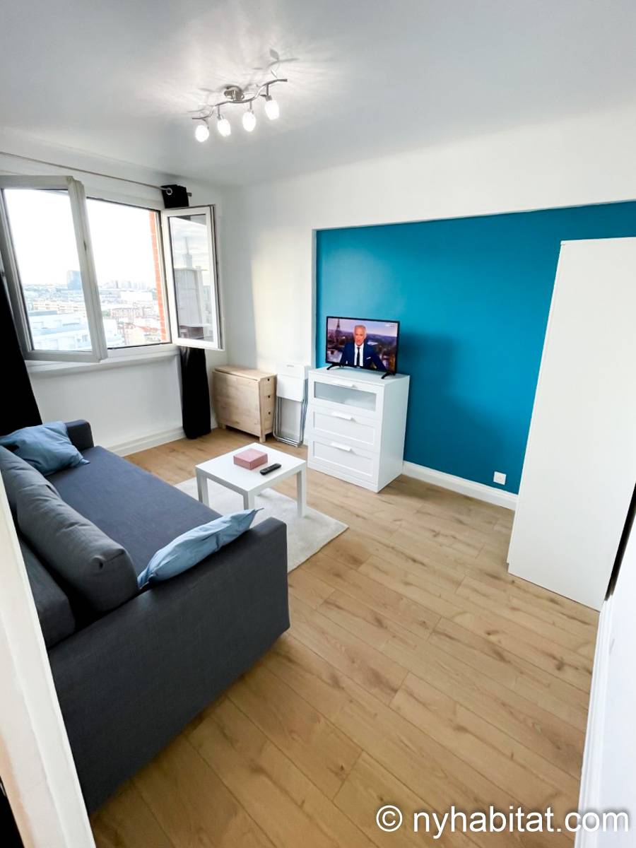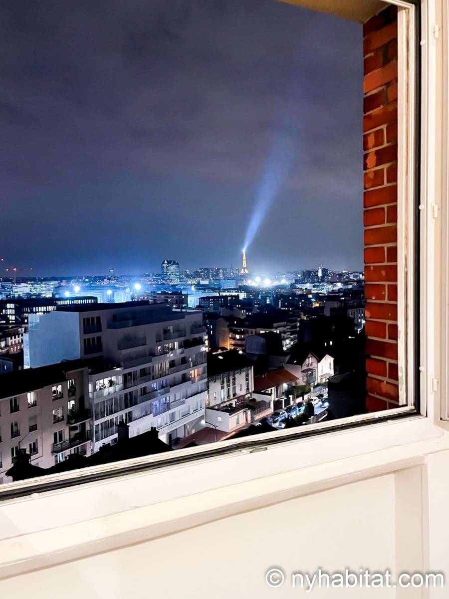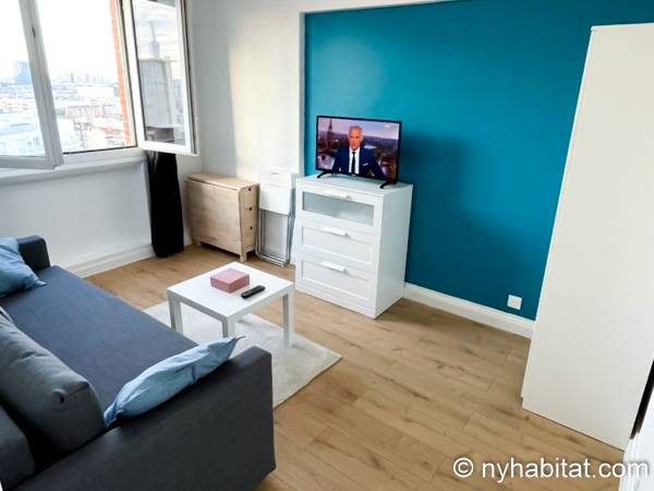 Experience Paris while residing outside the city center. Here is a furnished studio apartment. The 19 m2 (around 200 square-feet) rental is located in Issy-les-Moulineaux, a commune in the southwestern suburban area of Paris. This apartment sits on the 4th floor (equivalent to the 5th floor in the USA) of an elevator building near the intersection of Boulevard Rodin and Rue de la Défense. This apartment features unobstructed views of the city, including the Eiffel Tower, and a washing machine in the unit.