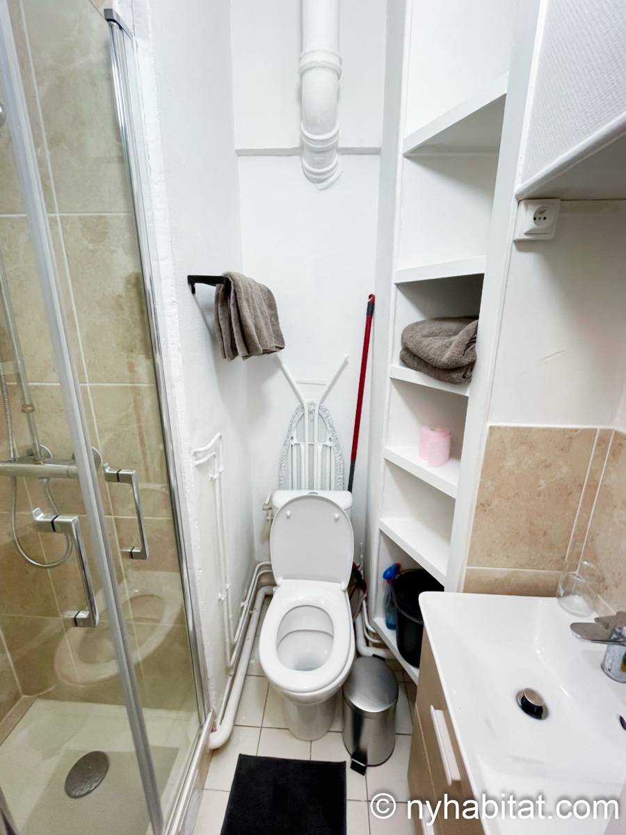 The living space is decorated with hardwood flooring and contemporary furniture, including a sofa bed that is double sized. The living space also contains a television, wardrobe, small dresser, and that window which provides the space with natural light, fresh air, and that view of Paris. Separated from the living room is the kitchen, which features tile floors and another window. The kitchen has a fridge, freezer, and a microwave, while also being the location of the washing machine. The bathroom, with tiles lining the floor and a portion of the walls, contains a shower.