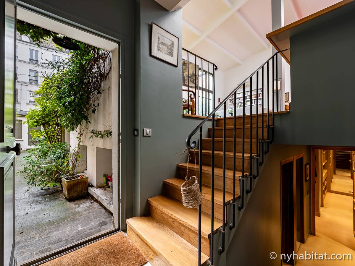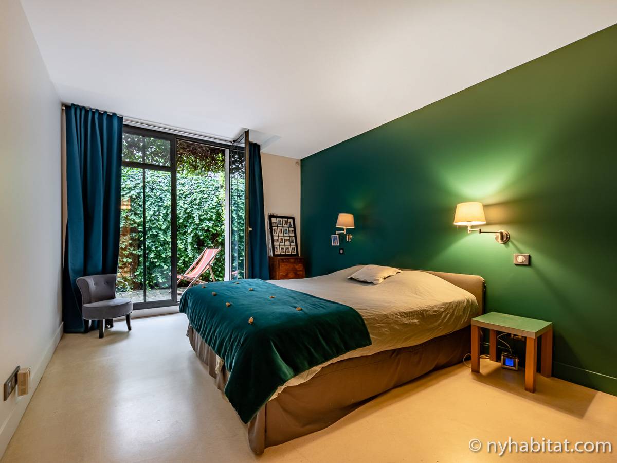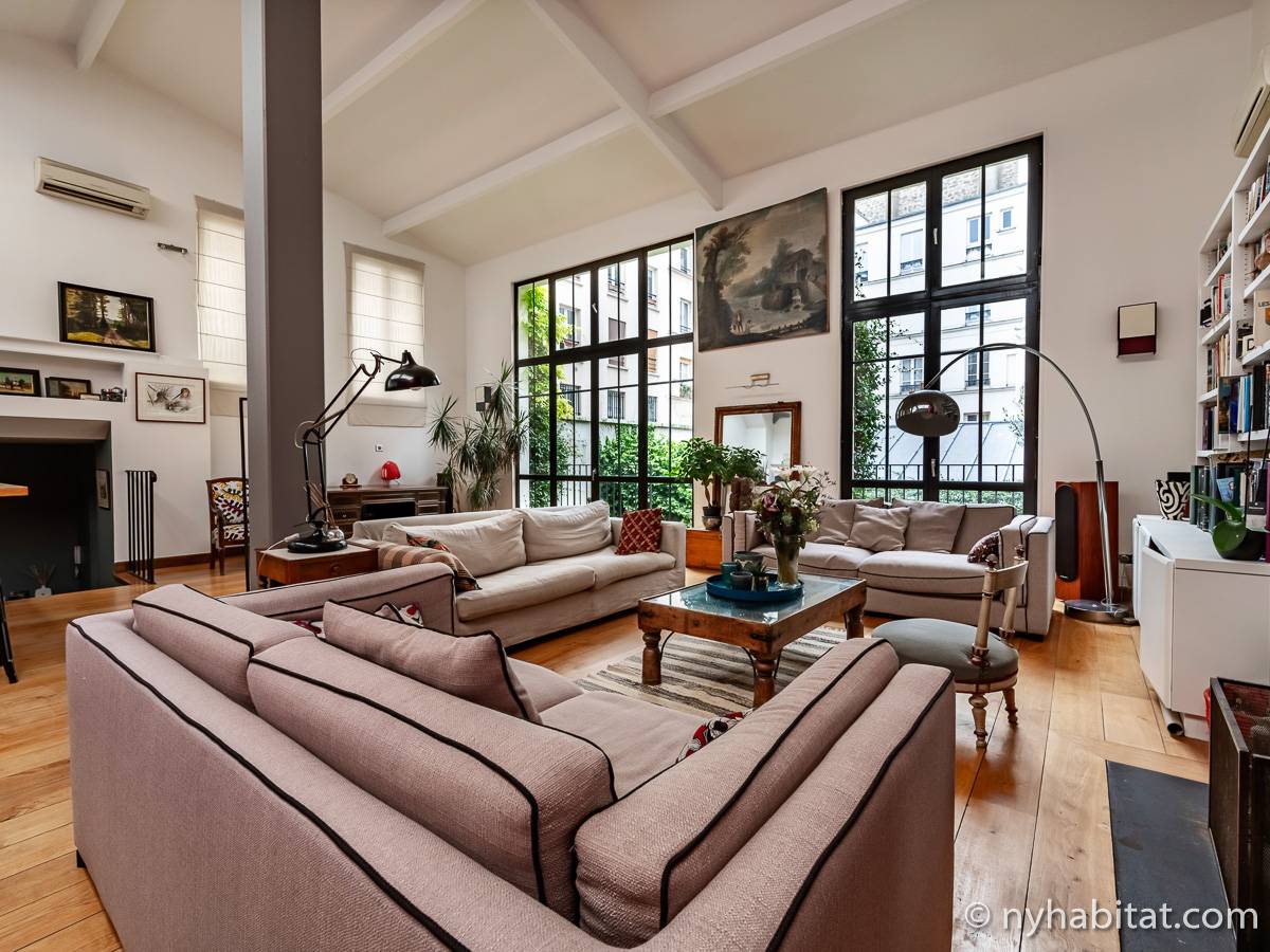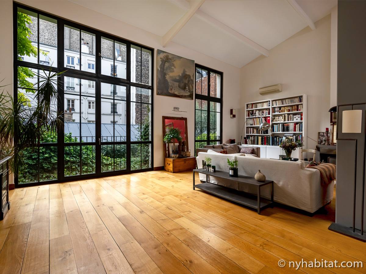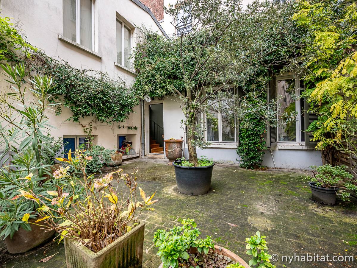 Here is a 5-bedroom, 3-bathroom furnished rental in the Batignolles area in Paris (17th Arrondissement). It is located between Rue des Dames and Rue Nollet in a 2-story building. The space is 180 square-meters (around 2,000 square-feet) with a terrace and a garden. There is also a washing machine and dryer.