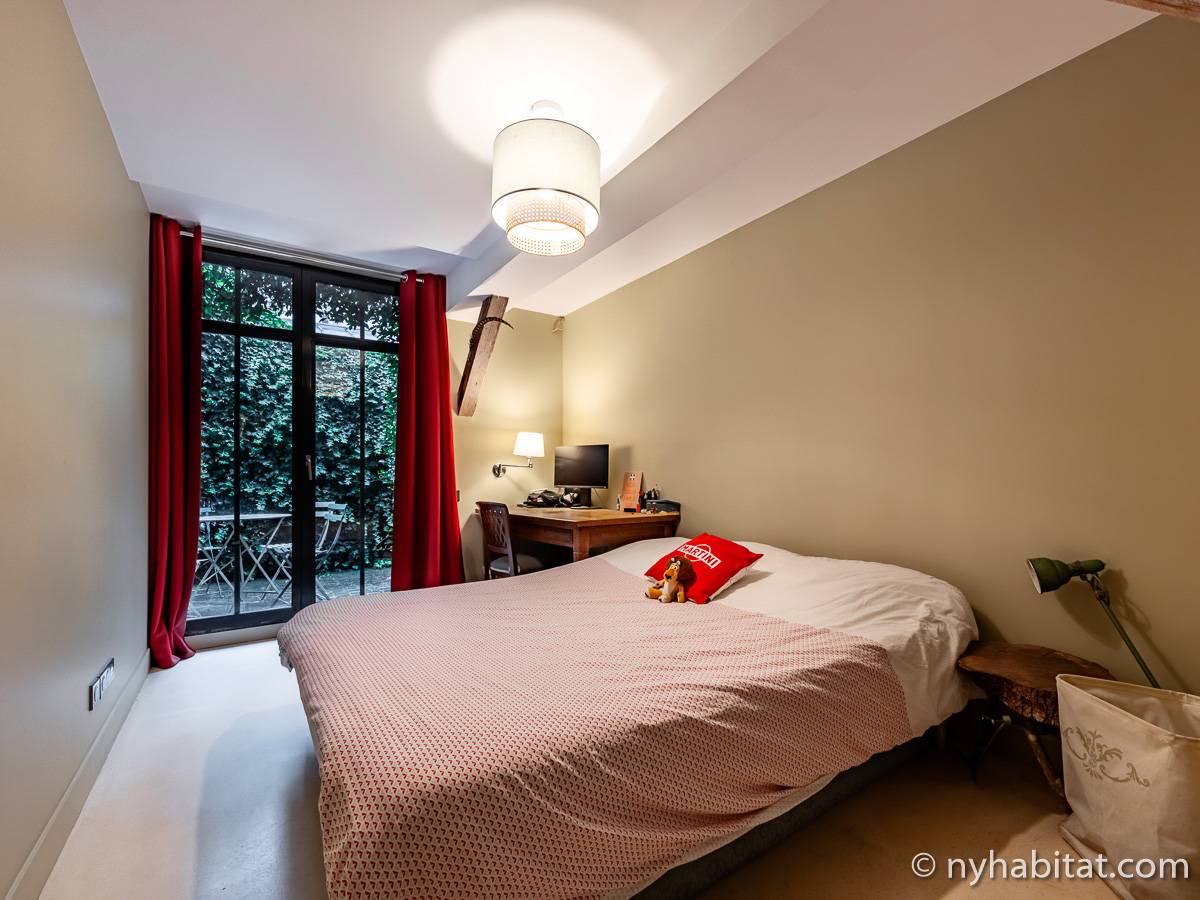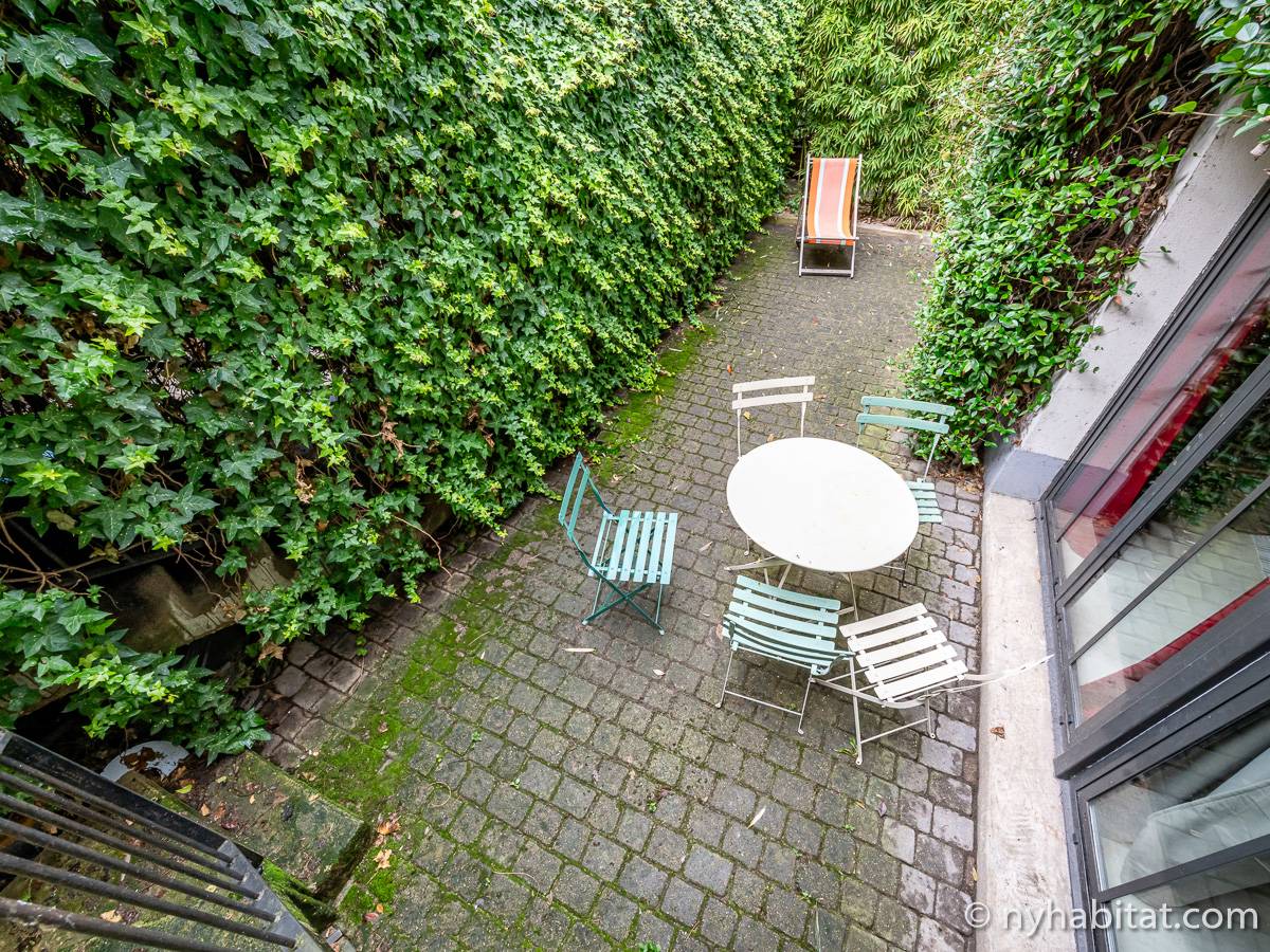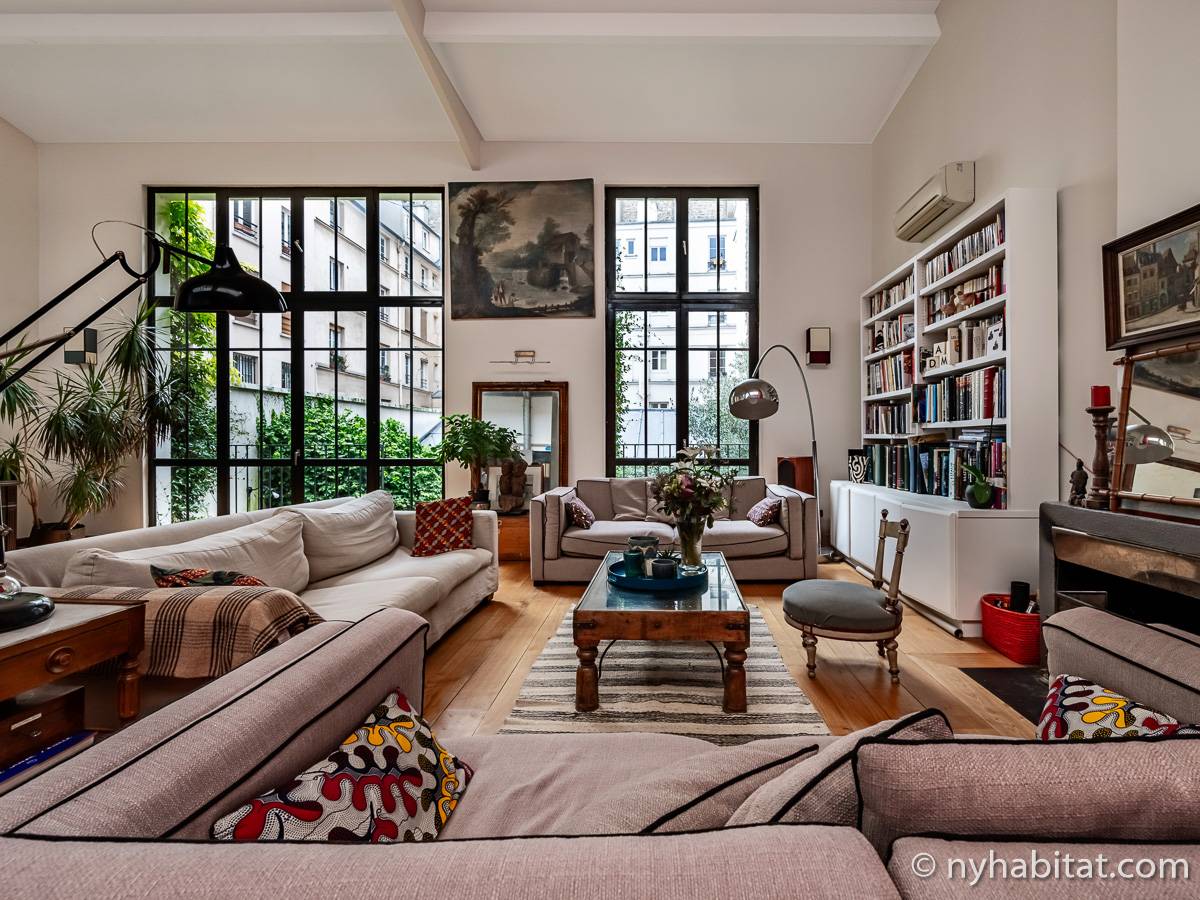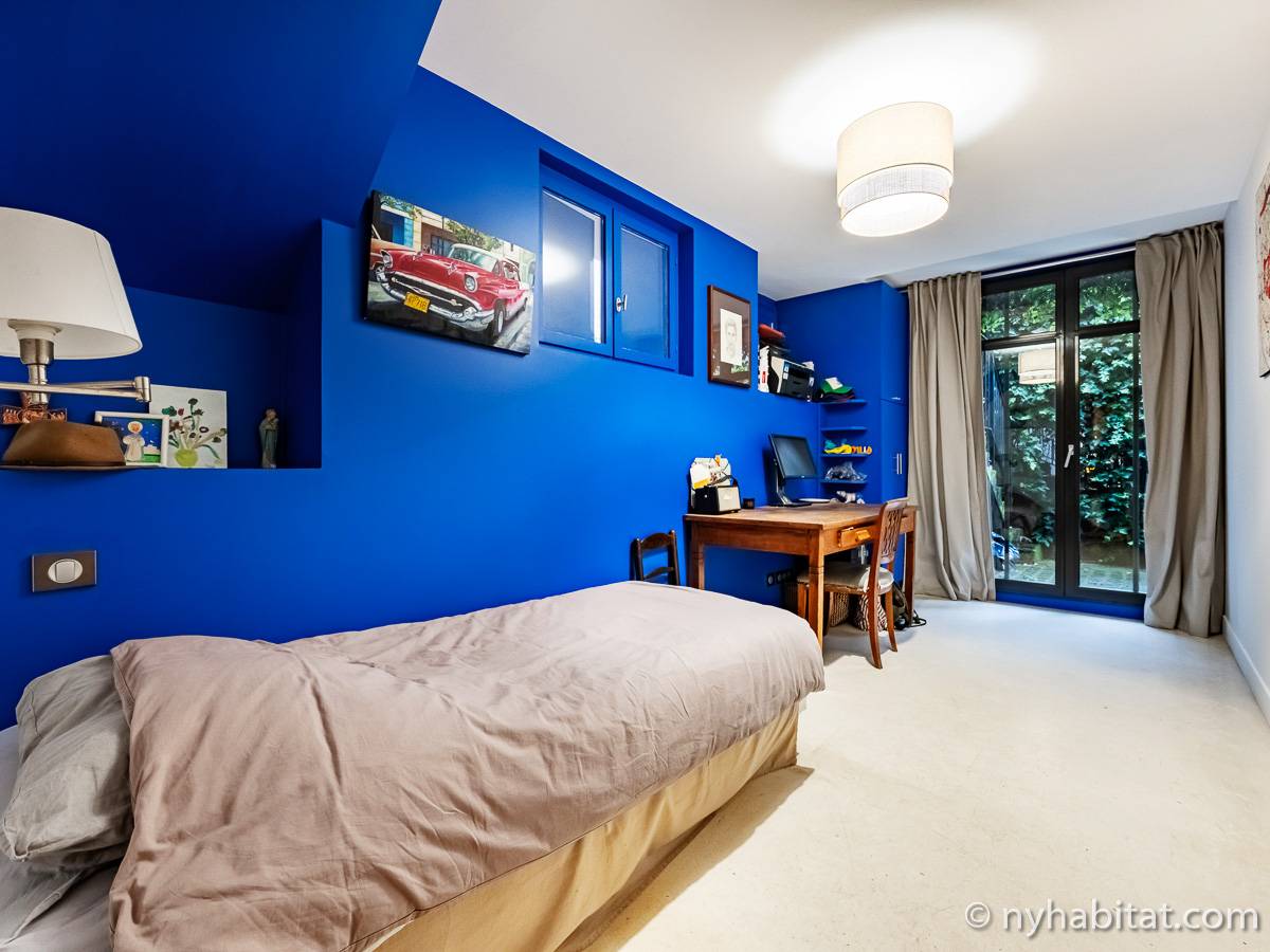 Here is a 5-bedroom, 3-bathroom furnished rental in the Batignolles area in Paris (17th Arrondissement). It is located between Rue des Dames and Rue Nollet in a 2-story building. The space is 180 square-meters (around 2,000 square-feet) with a terrace and a garden. There is also a washing machine and dryer.