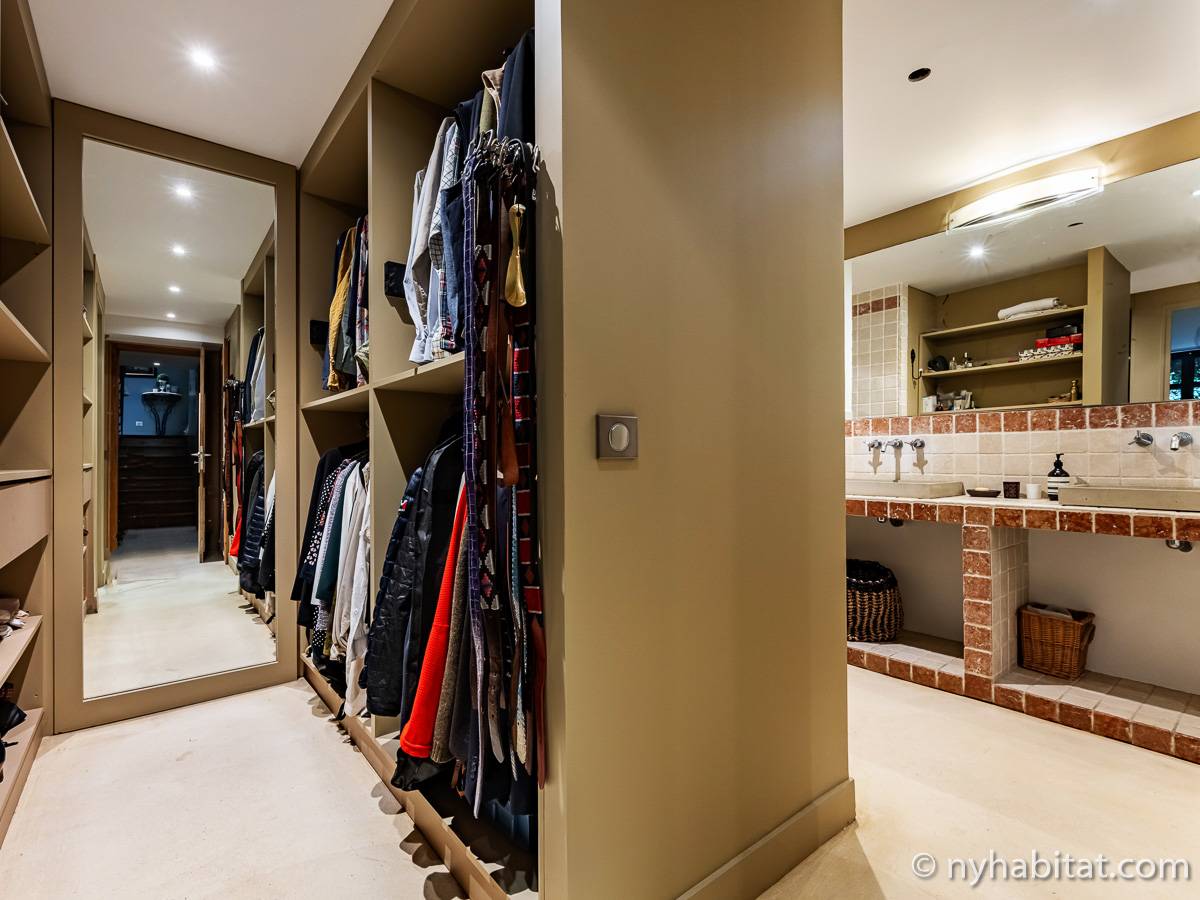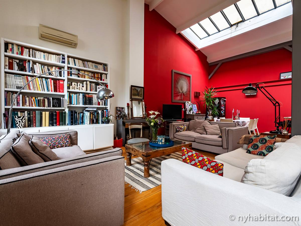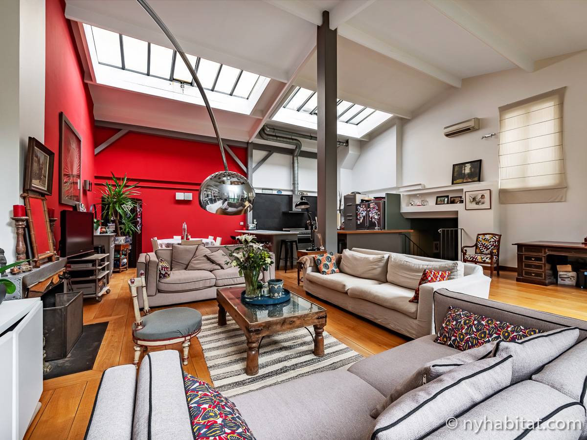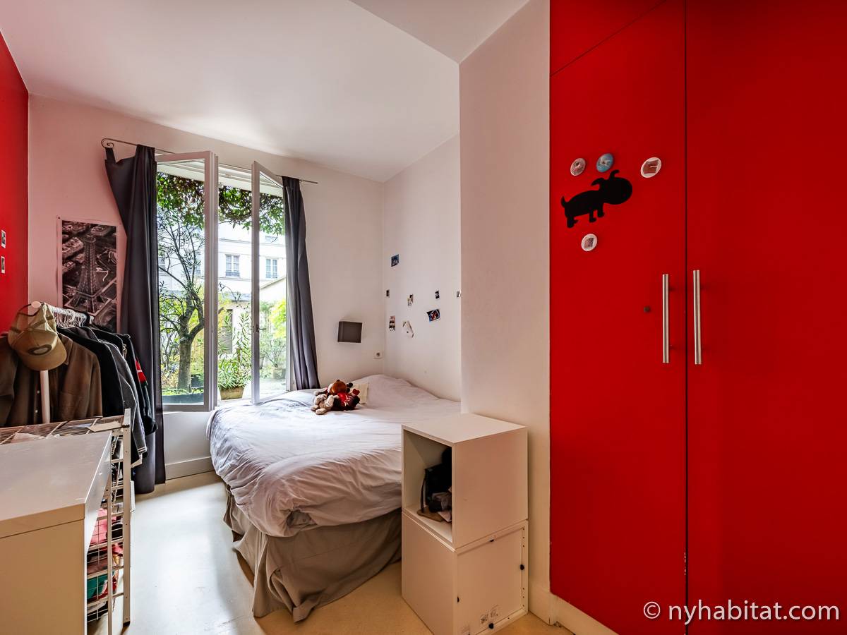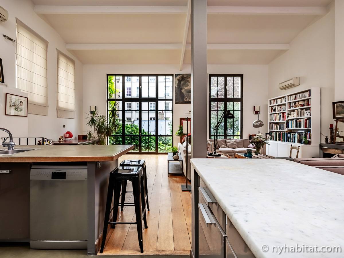 Here is a 5-bedroom, 3-bathroom furnished rental in the Batignolles area in Paris (17th Arrondissement). It is located between Rue des Dames and Rue Nollet in a 2-story building. The space is 180 square-meters (around 2,000 square-feet) with a terrace and a garden. There is also a washing machine and dryer.