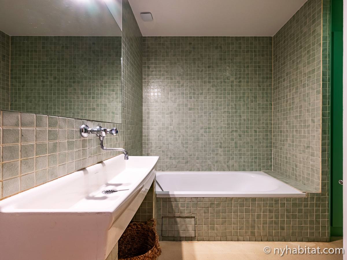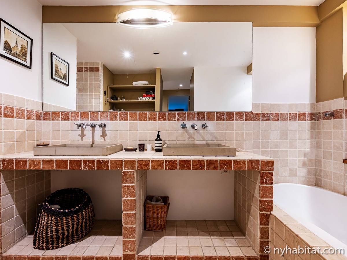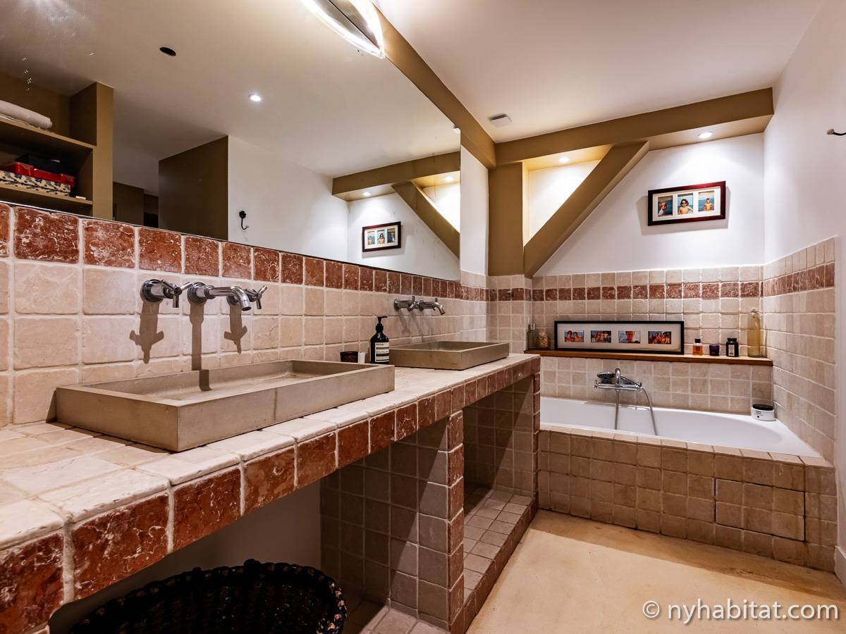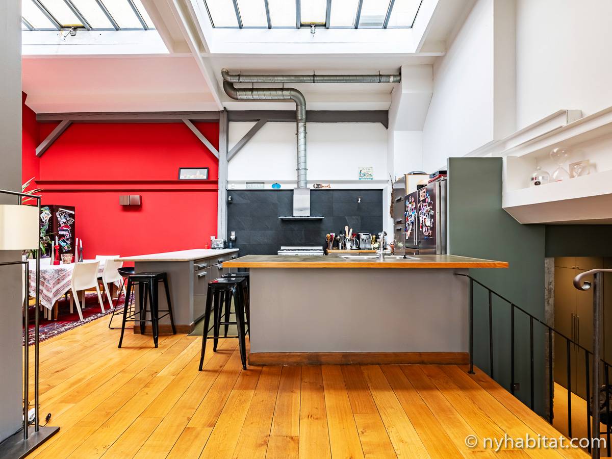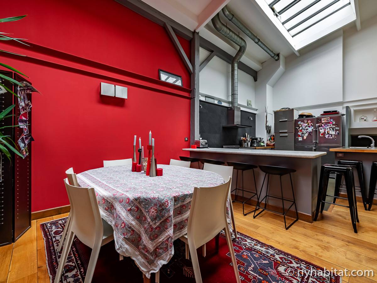 Here is a 5-bedroom, 3-bathroom furnished rental in the Batignolles area in Paris (17th Arrondissement). It is located between Rue des Dames and Rue Nollet in a 2-story building. The space is 180 square-meters (around 2,000 square-feet) with a terrace and a garden. There is also a washing machine and dryer.