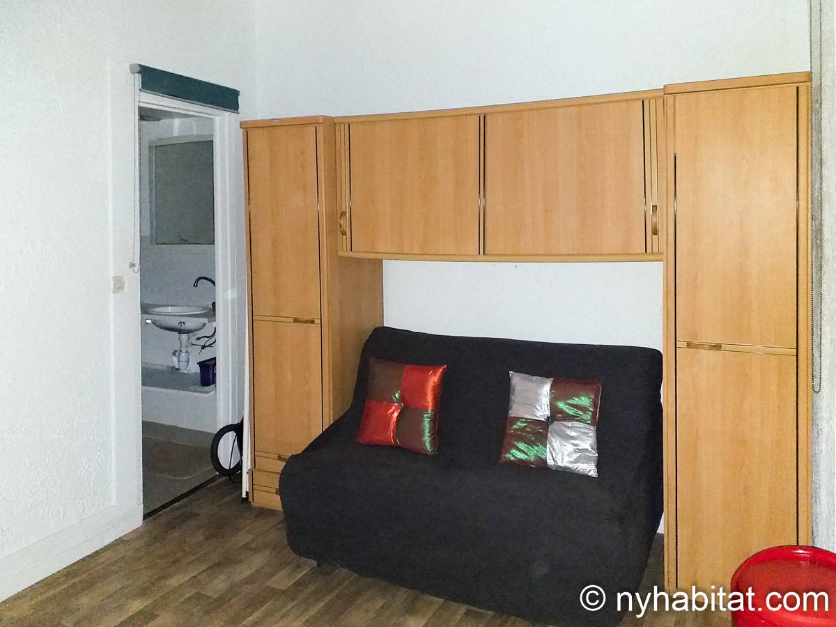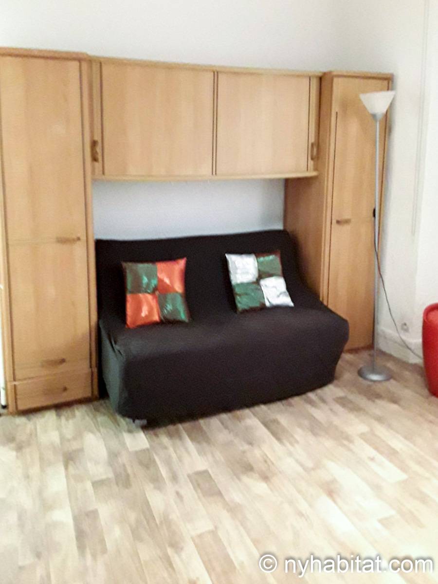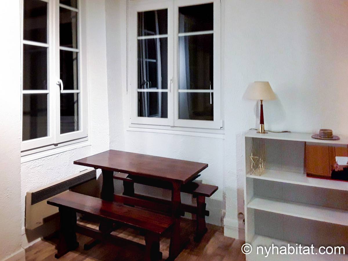 - The living room is furnished with a double sofa bed just ahead a closet, a rectangular country style wooden dining table with one bench and a chair, short portable bookshelves, an halogen floor lamp, and three windows opening to a narrow courtyard.