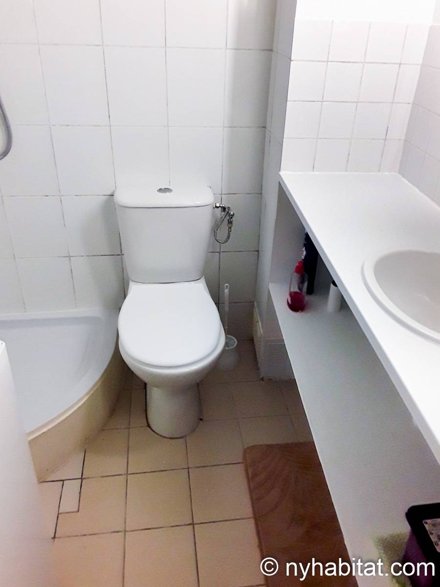 - In the bottom of the living room, to the left side the white tiled bathroom encloses a tiled shower, an oval washbasin with a large mirror above and large shelf below, a washing machine, and toilet.