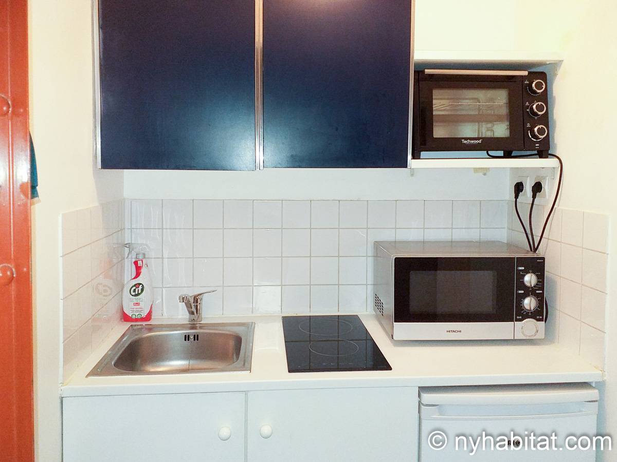 - Facing the main door the open kitchen is equipped with two electric burners, a small electric oven, a microwave, a fridge with freezer compartment, and the necessary utensils put away in the cupboards above and below the worktop and stainless steel sink.
