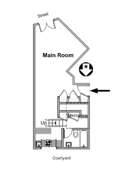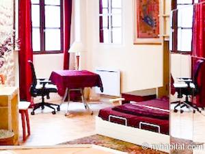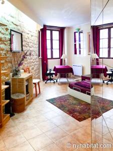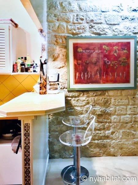 Covering a total of 35sqm (376sqft), this commodious studio in the St Germain area includes a main room, open kitchen, bathroom and a small loft area with twin mattress accessible by ladder, which can be used as a storage room or sleeping space.