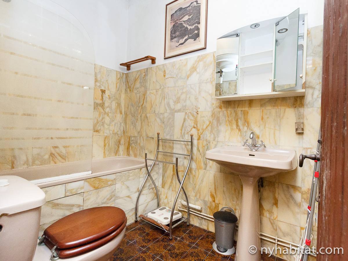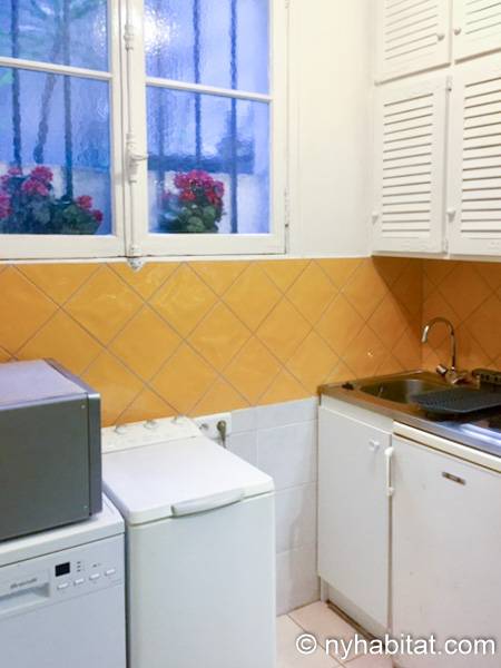 Demonstrating a warm and lived-in feel, this studio apartment welcomes its tenants with an exposed white brick wall and tiled floors. Décor includes a small electric decorative fireplace, hanging artwork and some potted plants! For your comfort and convenience, the following amenities are provided: double sofa bed, television and private laundry washer/dryer. There is an open kitchen with most essential cooking appliances, including a dishwasher for easy clean-up.