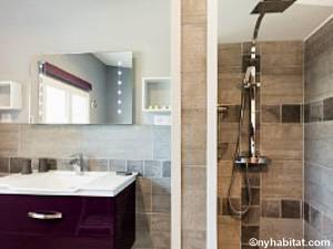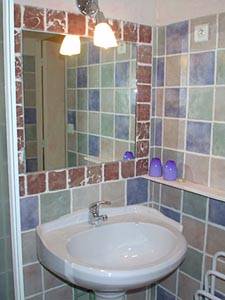 Bedroom 2: Léonie is furnished with a double size bed, and has west exposure. A French window gives access to a private and quiet terrace, at the back of the house. The bathroom is also in the bedroom. It has a washbasin with mirror, a stall shower and separate toilet.