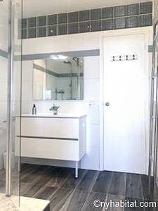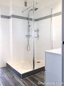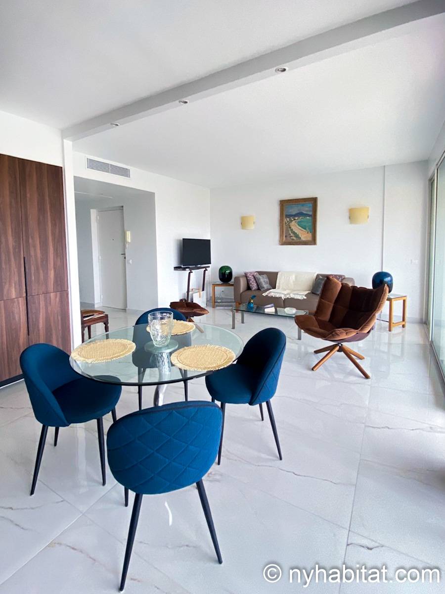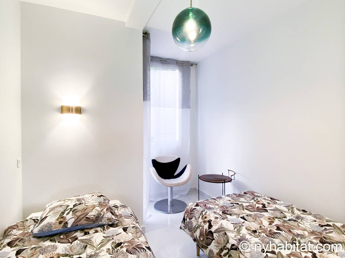 This nicely decorated two-bedroom apartment is furnished with all the amenities needed for a stay in Nice. The bright living room has a a double-sized sofa bed, a coffee table and two chairs. There is also a table with chairs next to the sliding glass doors that give access to the large terrace. The kitchen is separate and equipped with a fridge, an oven, a dishwasher and a microwave. The first bedroom is furnished with a double-sized bed, a desk and a TV for your entertainment. The second bedroom has 2 single beds. The white tiled bathroom has a shower and two sinks. You will also have the convenience of a washing machine in the apartment.
