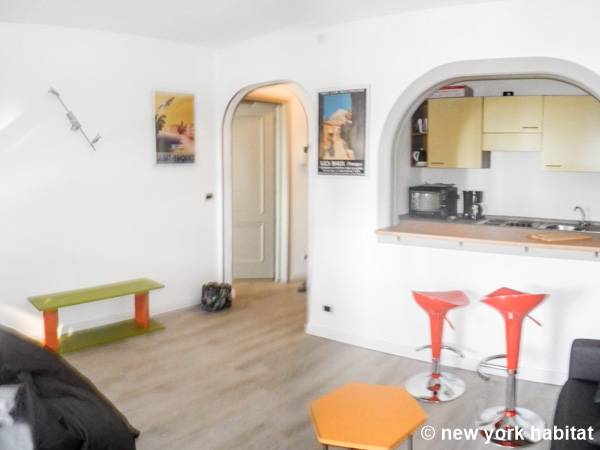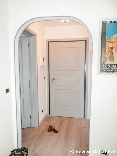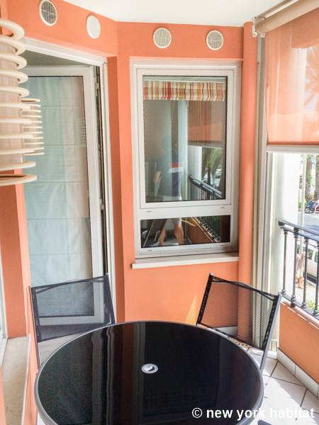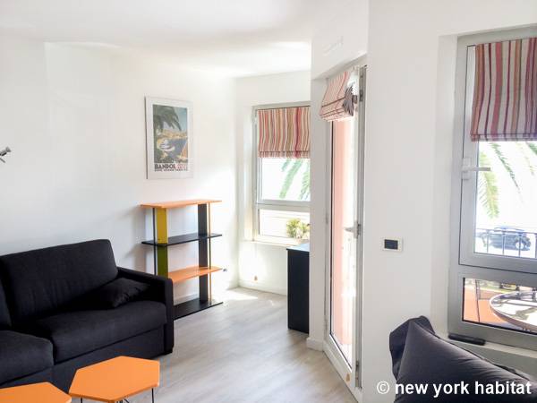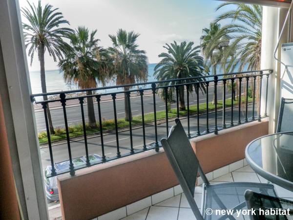Sitting on Promenade des Anglais & Rue Aubry Lecomte, the one bedroom apartment is set in an ideal location facing the clear blue water of the Mediterranean Sea, the soft sand of the beach and the palm trees that line the street. It is on the 2nd French floor (considered 3rd floor in U.S.) of an 8-story elevator building protected by an intercom security system. The apartment includes a private balcony overlooking the sea.