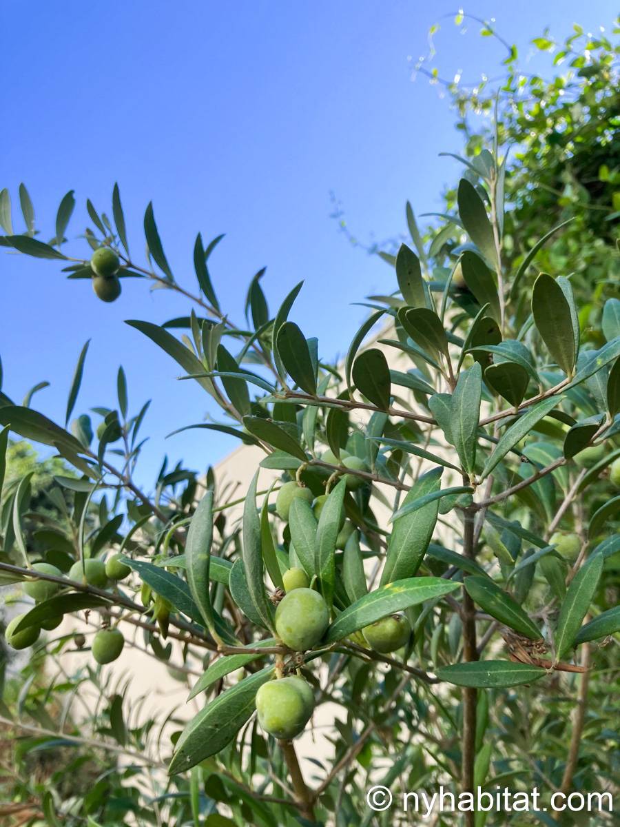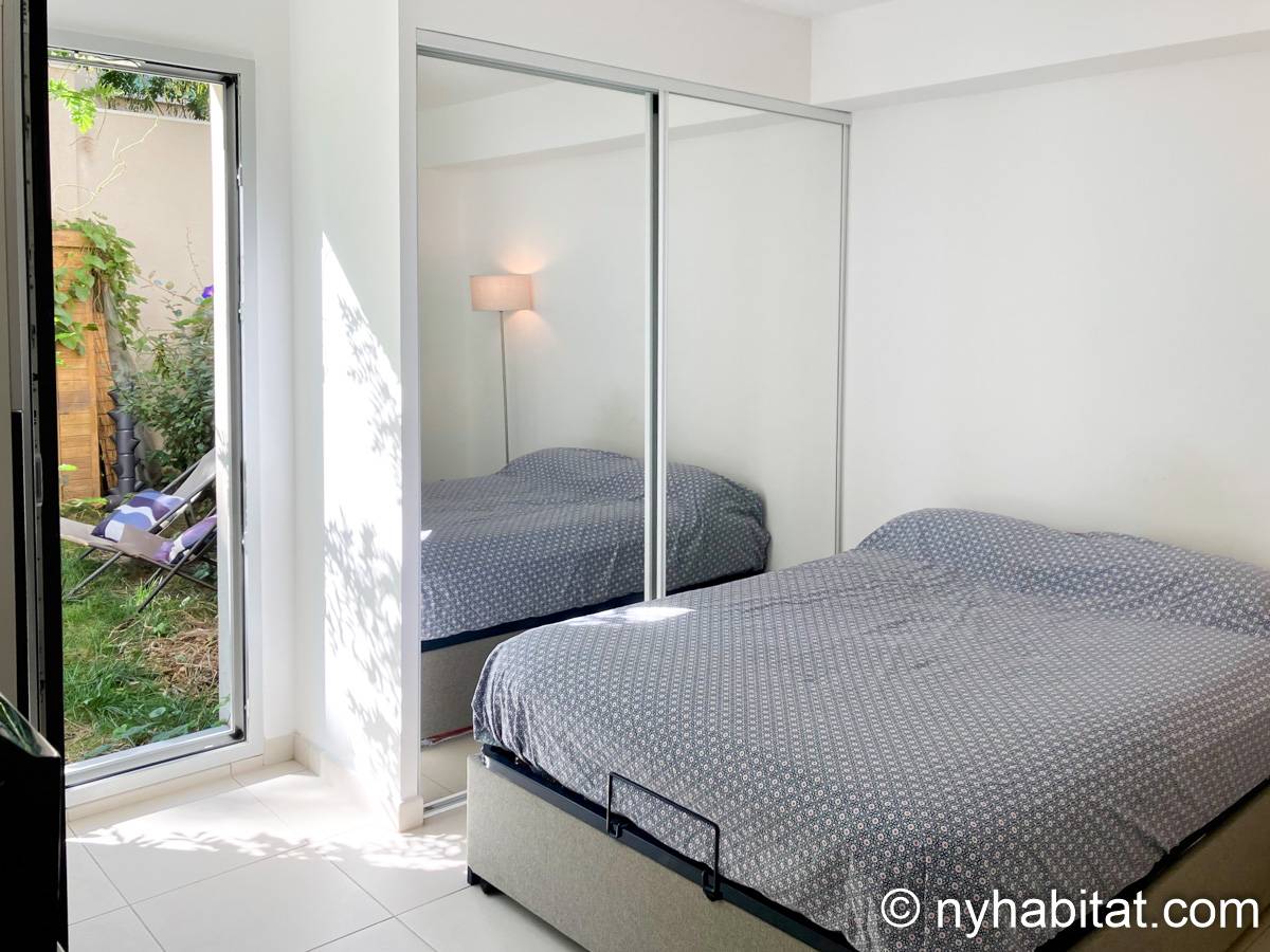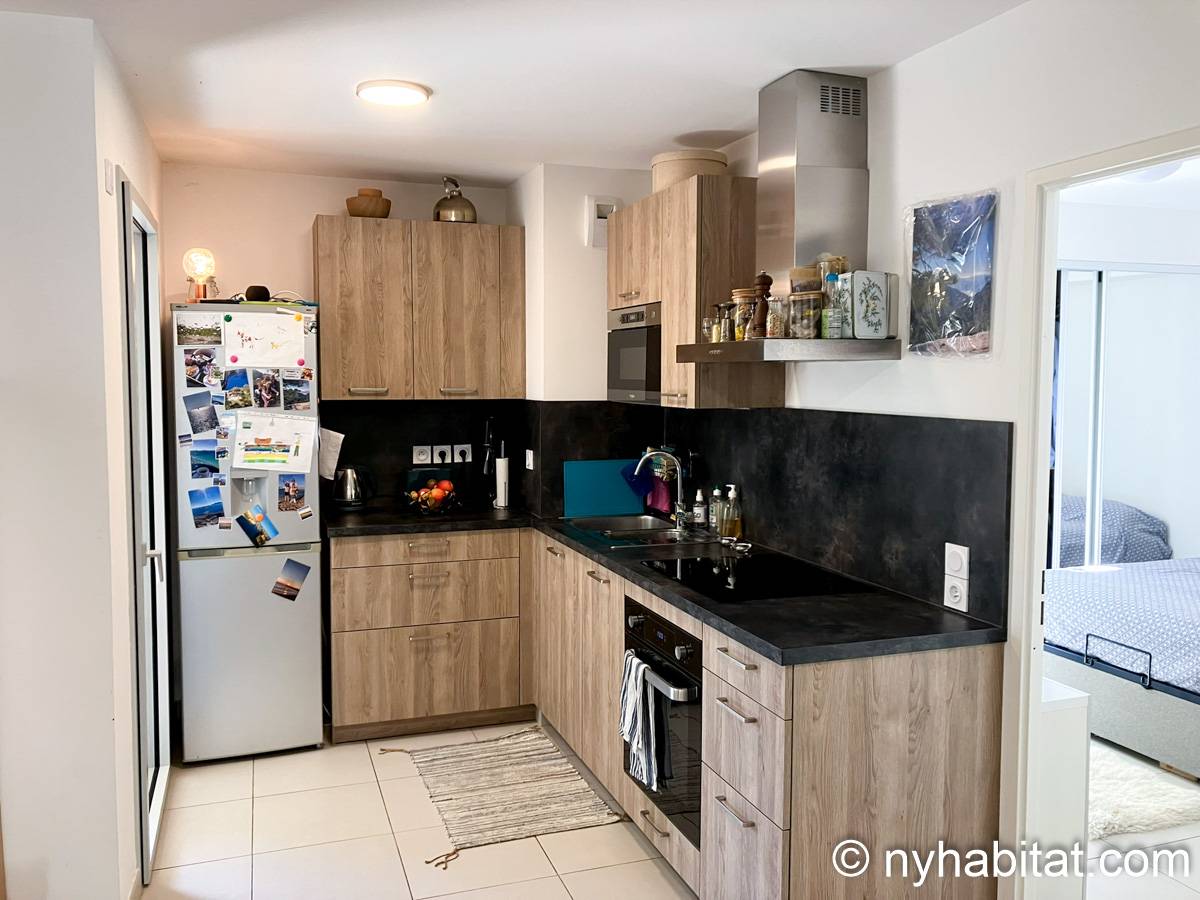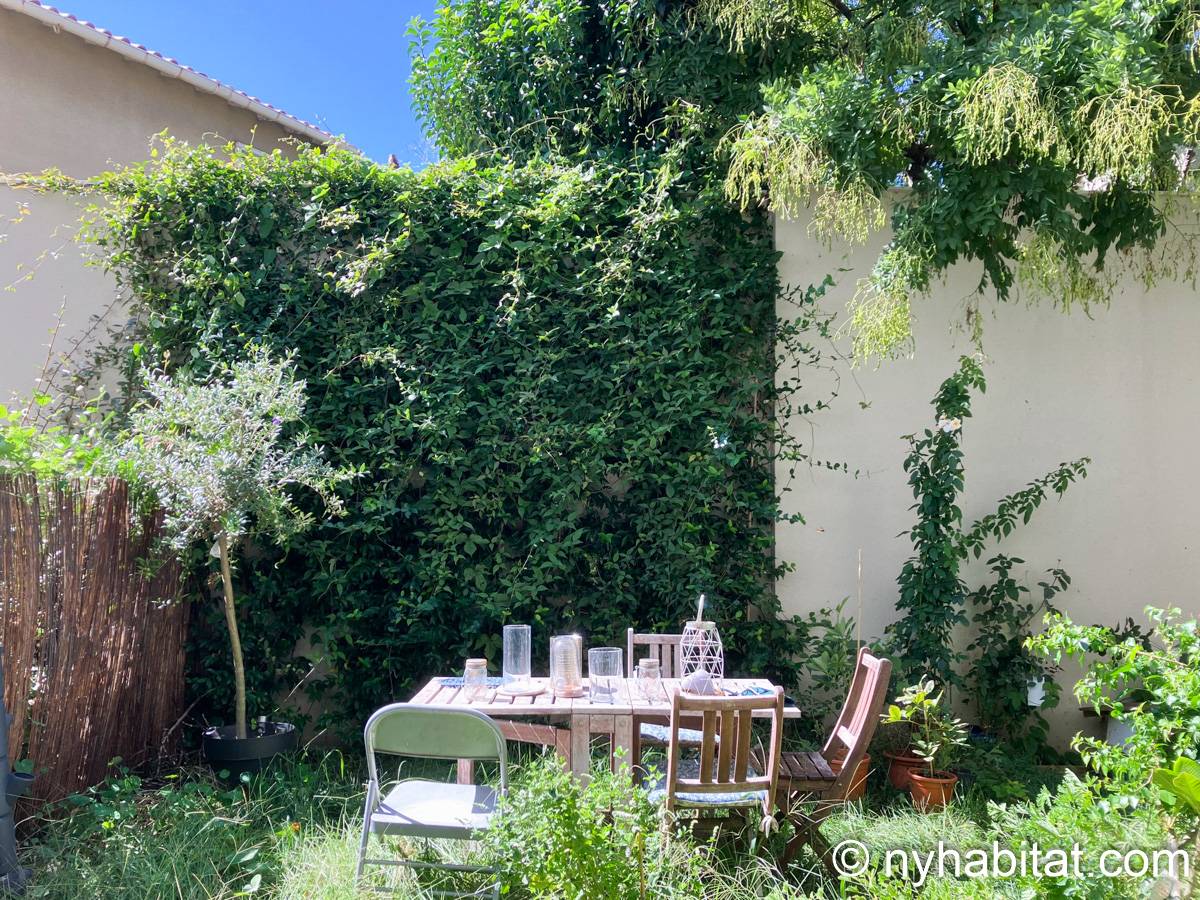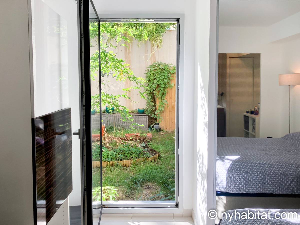 This garden is itself a 50 m2 (around 540-square-foot) green space. The apartment bedroom has a double-size bed and gives you direct access to this garden. The doorway to the garden also works as a window, allowing you to enjoy the view and sunlight even without stepping outside. The living room of this furnished rental has a sofa and a dining table. Here, there is another large window to allow natural light into the space. The open kitchen has an oven, a microwave, fridge, freezer and a coffee maker for your cooking needs. The bathroom has a shower.