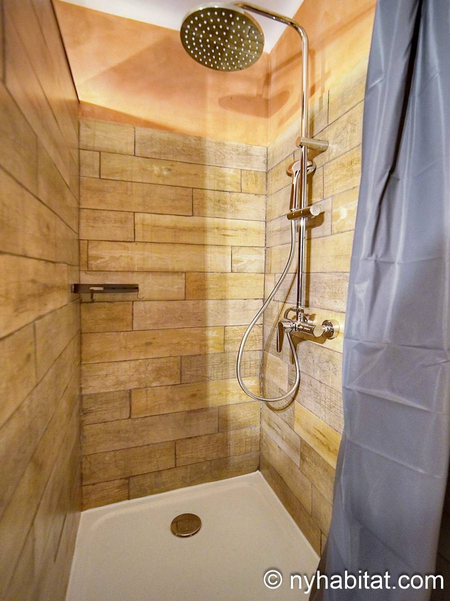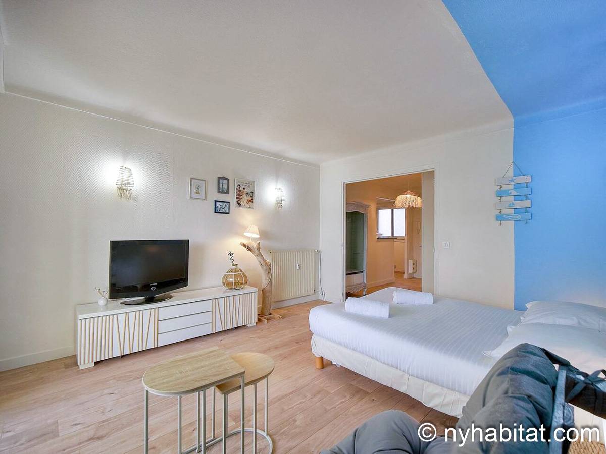 This furnished rental includes a living area with a double bed, air conditioning, a TV, and access to a balcony with a dining table for meals with city views. The separate kitchen is fully equipped with an oven, microwave, fridge, freezer, coffeemaker, toaster, and dishwasher, providing everything you need to prepare your meals. The apartment also includes a bathroom with a shower.
