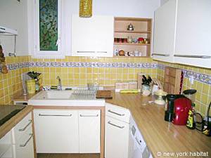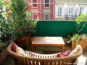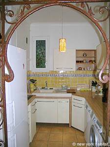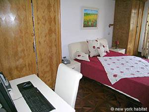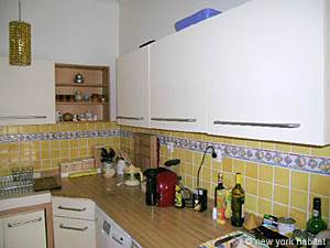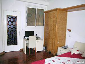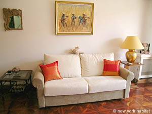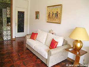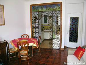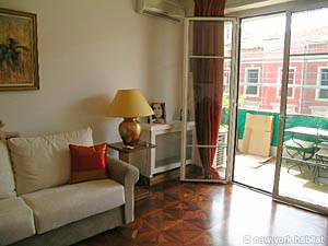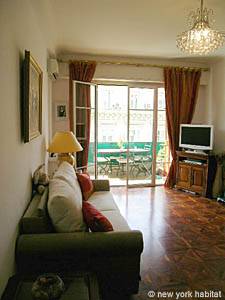 The living room is furnished with a convertible sofa bed (double size), and a dining table seating 4. There is a TV (CABLE with 75 Channels)and a stereo system with CD player. A French window leads to the terrace that overlooks the street. The terrace has a dining table seating 4.
