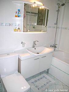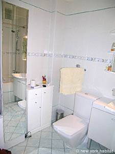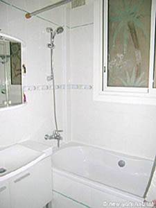 The bathroom has a bathtub, a sink with mirror and water closet. There is a large walk-in closet in the entrance.