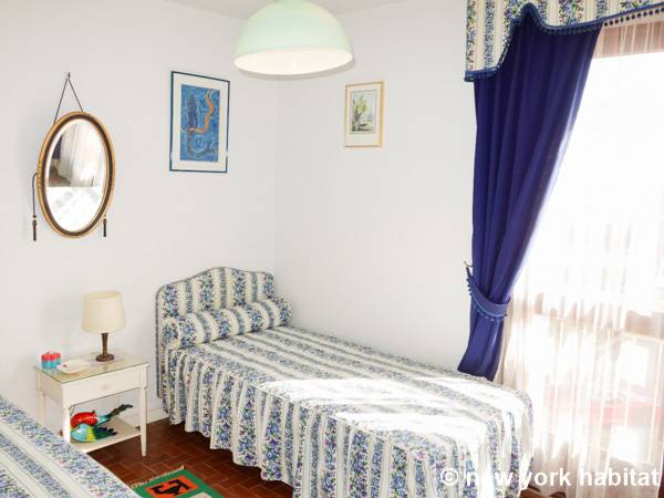 The second bedroom is furnished with two single beds, bedside tables and a chest of drawers. There is a window opening onto the private courtyard.