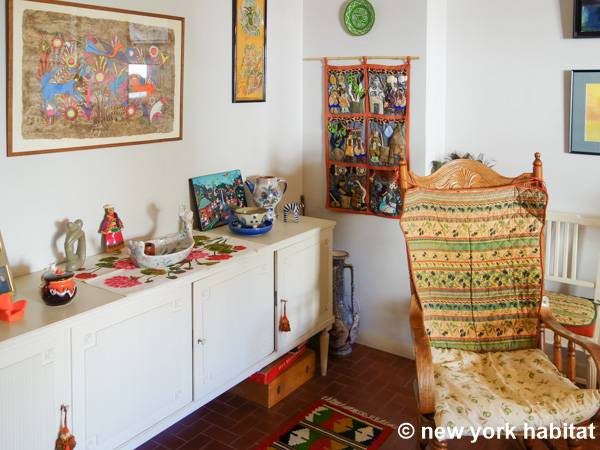 The 30m2 living room has a round dining table, a cupboard, a sofa, a coffee table, 2 armchairs, and a TV. There is also a large piano in this space available for the tenants use.