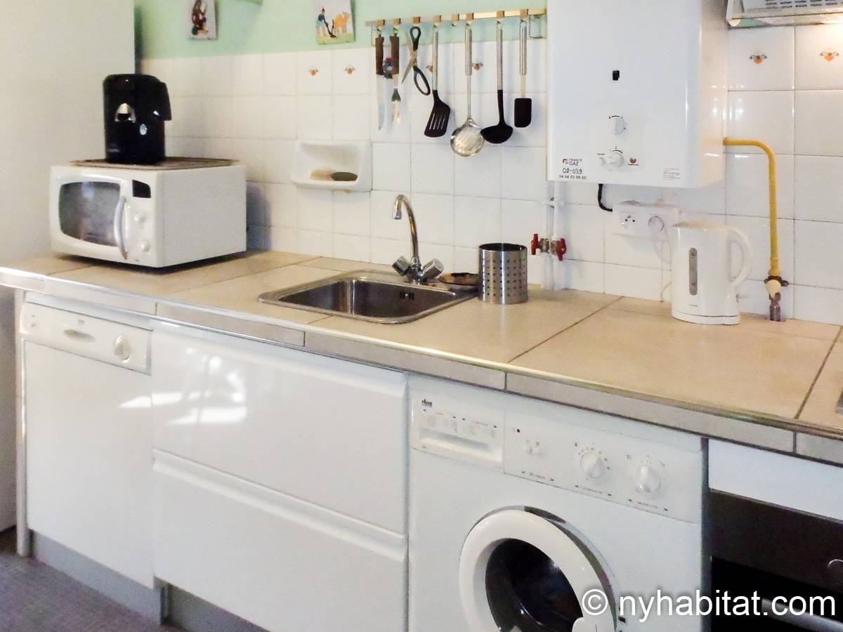 Next is the separate kitchen with a sink, 2 gas burners and one Bosch electric oven with self-cleaning surfaces, a refrigerator and freezer, a toaster, a microwave oven, a dishwasher and a coffee maker and a juice extractor. There is a washing machine and a small dining table.