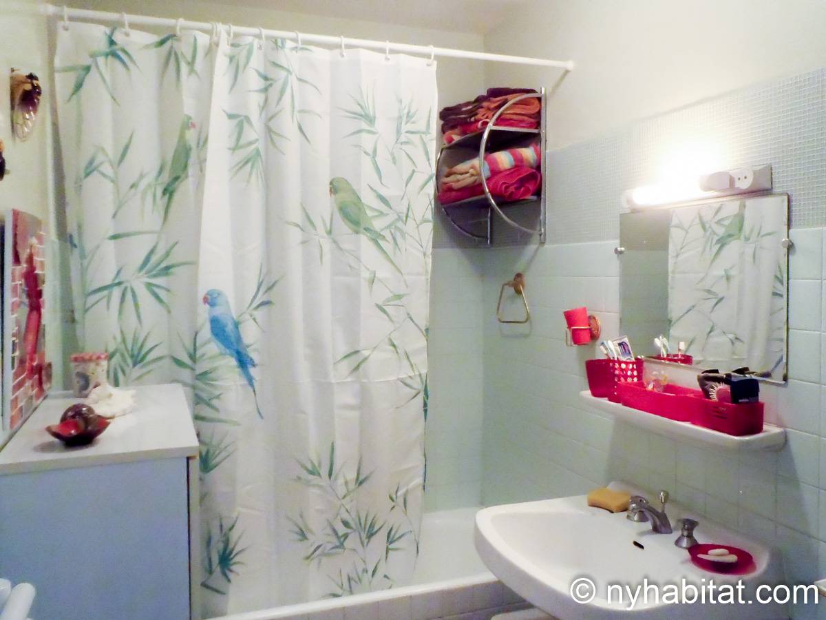 The bathroom has a tub/shower, a washbasin and a French bidet. There is a separate WC.