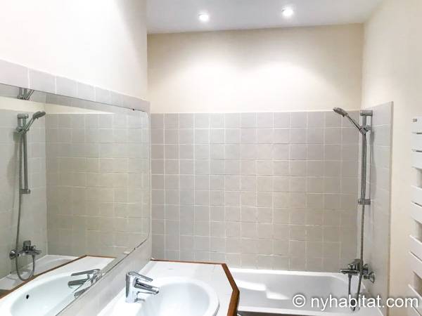 The first bedroom, is furnished with a double bed and a wardrobe. There is an en-suite (but separated) bathroom with a double washbasin and a tub.
