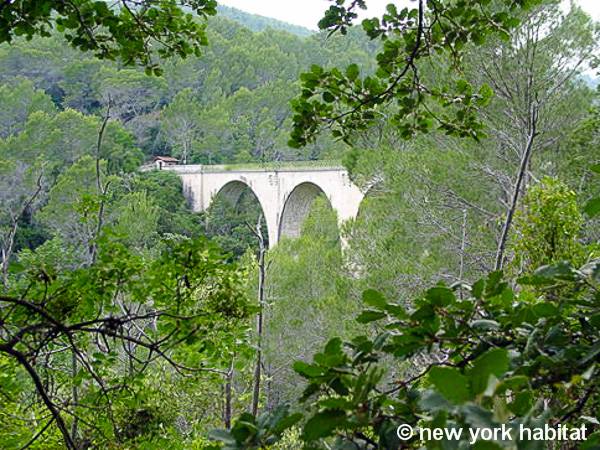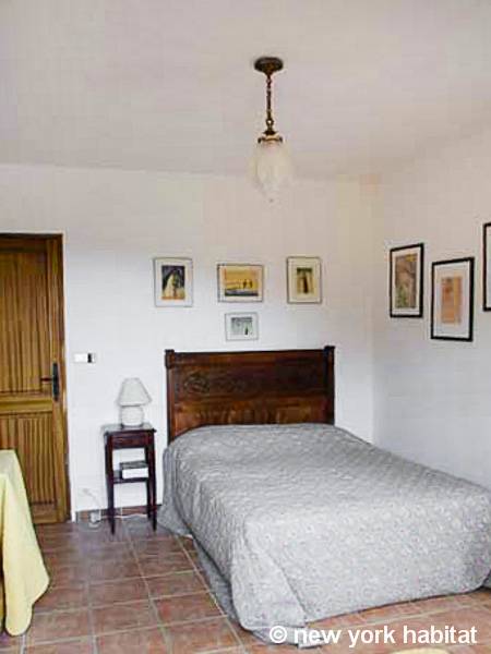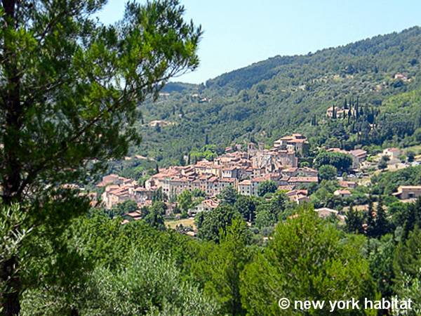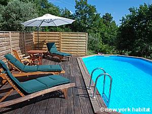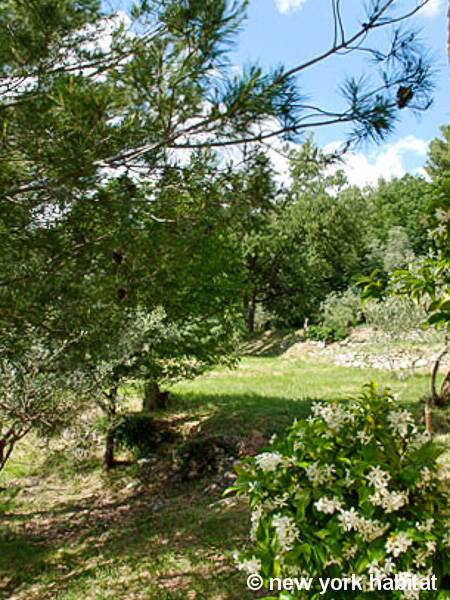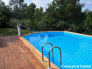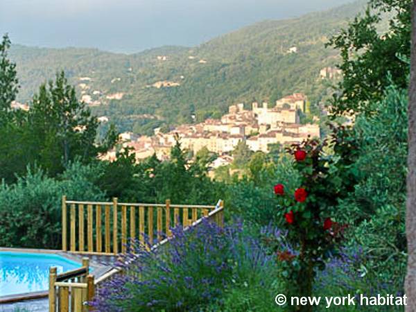 The front of the villa has a southern exposure, allowing in lots of sunlight from morning to evening. The windows and terrace offer breathtaking views of the village rooftops and neighboring hills. The terrace has a table that comfortably seats six guests for pleasant alfresco meals. Surrounding the villa is an olive grove, and below it several grassy terraces fronted with stone walls, which are characteristic of the Provence-Alpes-Côte d'Azur region. The accommodation features a 10-meter (33-ft) pool with a wooden deck containing sun loungers and parasols.