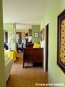 The 60-m² (approx. 645 sq ft) living room features a working fireplace and is furnished with two sofas and armchairs facing a coffee table and TV. On one wall, sliding glass doors open onto the patio, and on another, a wide arched wall opening connects to the dining space, furnished with a rectangular wooden dining table with 8 chairs. Next to it is the open kitchen, equipped with all of the main appliances and crockery, in addition to tableware and silverware.