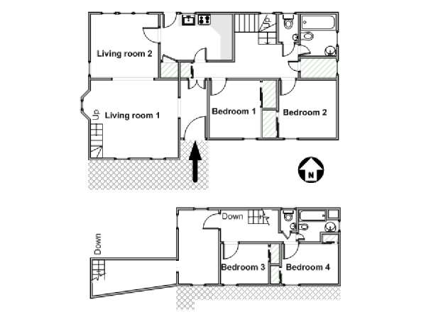 Bedrooms one and two are also downstairs, furnished with a queen bed and a double bed respectively. On the upper level, bedroom three offers another queen bed, while bedroom four has a king bed. All of the bedrooms are climate-controlled. There is also a lounge room upstairs with sofas and a television. Two bathrooms and two separate WCs are available.