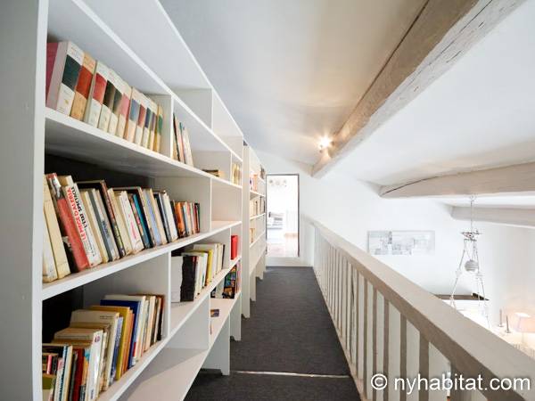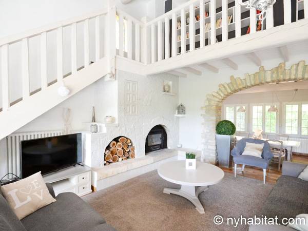 The accommodation’s décor combines contemporary design with traditional architectural elements like the exposed stone archways and wooden beams. On the lower floor, you’ll find the living room, furnished with several sofas, a functional fireplace and a cable television, and the dining room, whose table seats up to eight. The separate kitchen is also located on the lower floor, offering essentials like a gas stove and oven, a microwave, and a dishwasher.