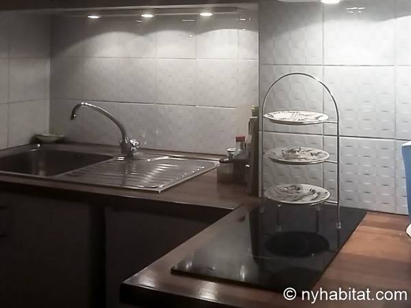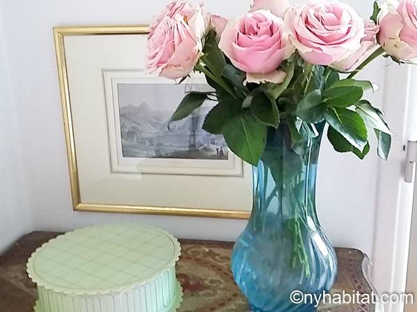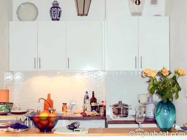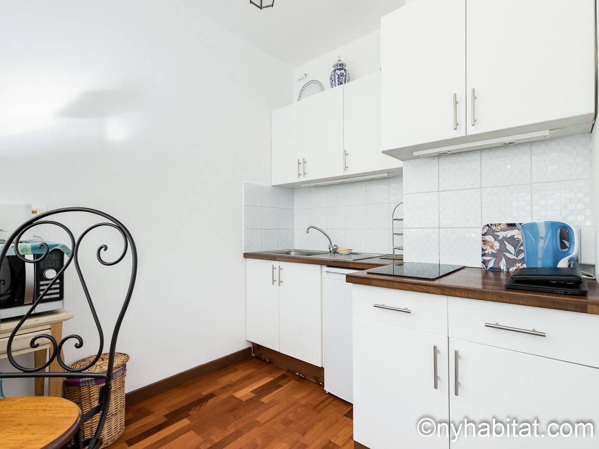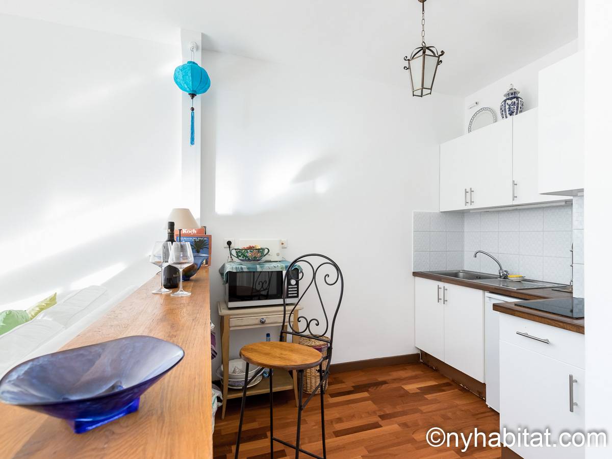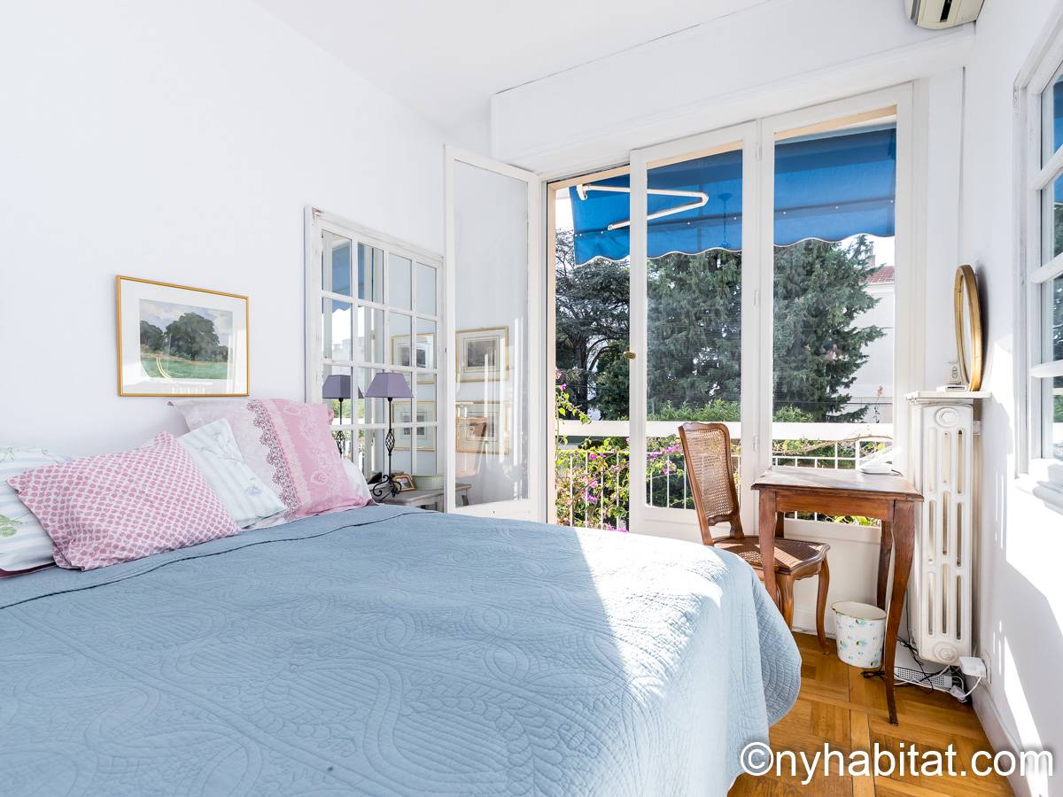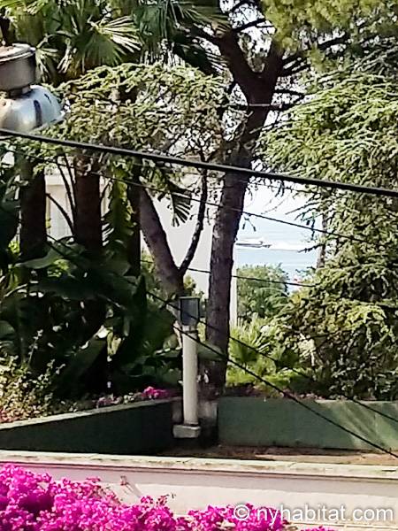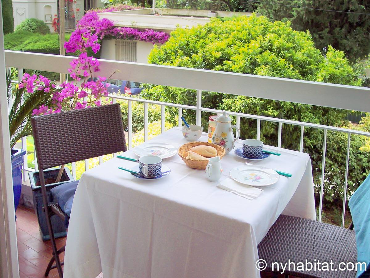 Upon entering this fully furnished apartment, find natural light and a cozy décor. The living room has a sofa, a dining table and floor-to-ceiling window doors that open onto a private balcony. The balcony has a table, providing a great way to start the day with croissants and coffee under the sun of the French Riviera! The kitchen is open, and has all the necessary cookware and dishware. The bedroom is furnished with a double-sized bed, a desk, and a bedside table.