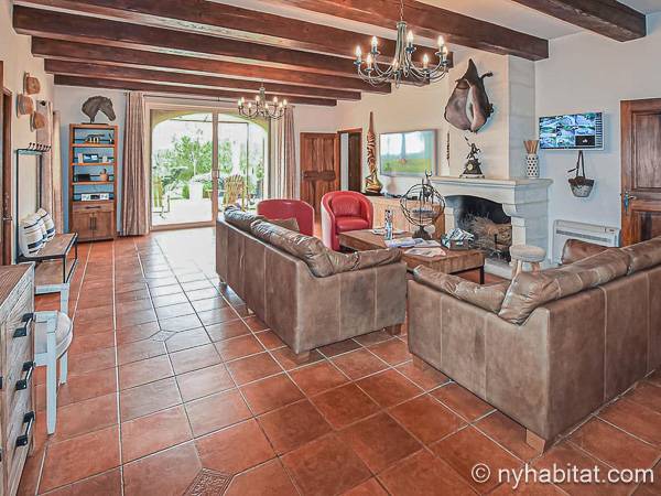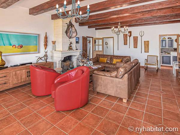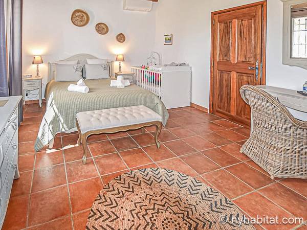 The villa is provincial with exposed wooden beams in many of the rooms, rougy-brown tile flooring under contemporary furnishings, a decorative fireplace and a loft area. Inside, a large dining table offers a place out of the sun for you to take your lunch. A second dining table and smaller patio tables outside invite you to eat in the open air, perhaps a morning or an evening meal when the sun sits lower in the sky. The open kitchen has what you need—an oven, a fridge, a freezer, a microwave, a toaster, a coffeemaker, and a dishwasher—to fill the table with food. Three of the five bedrooms have a queen-size bed. The other two have two single beds each. All five bedrooms have air conditioning and a TV. The five bathrooms each have a shower and two have a tub. When the sun sets, garden lights illuminate the property, spotlighting choice plants and highlighting paths.
