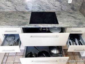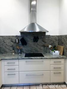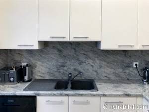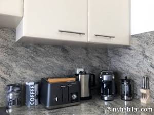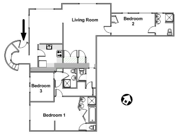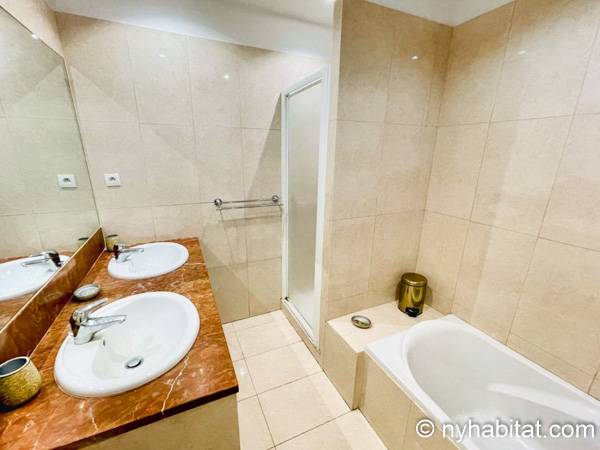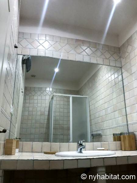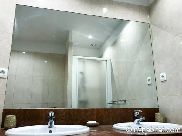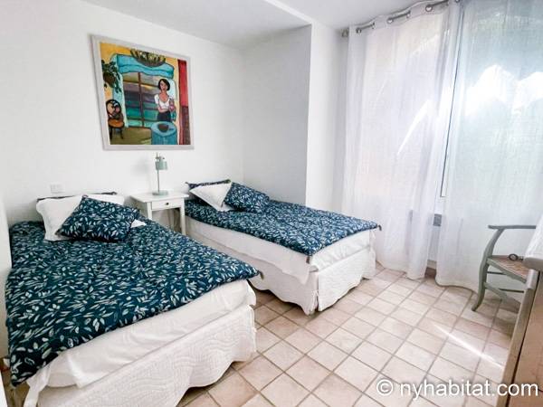 The naturally-lit living room has large paneled glass doors and tile flooring. Enjoy the living space while sitting on the sofa or on one of the chairs. In the separated kitchen, appliances include an oven, freezer, microwave, coffeemaker, toaster, and a fridge. Two of the bedrooms have a double-size bed while the last one has two single-size beds. Among the bathrooms, two of them are half-bathrooms with only a toilet. Two are full bathrooms, with both a toilet and a shower. And there is a room with a shower and tub. The dining room has a window alongside a large dining table, a bureau, and a chandelier.
