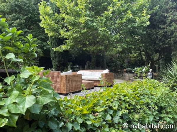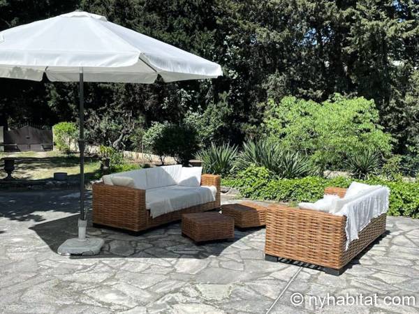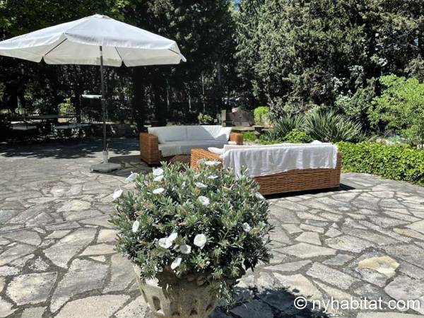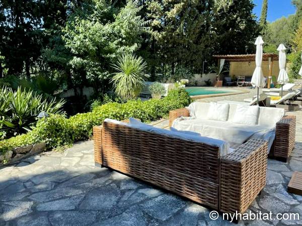 Through a sliding door is an outside patio with a pool and several seating areas—including couches, lounge chairs, and tables. While sitting in the back garden, you can eat brunch or enjoy the sounds of nature while relaxing poolside.