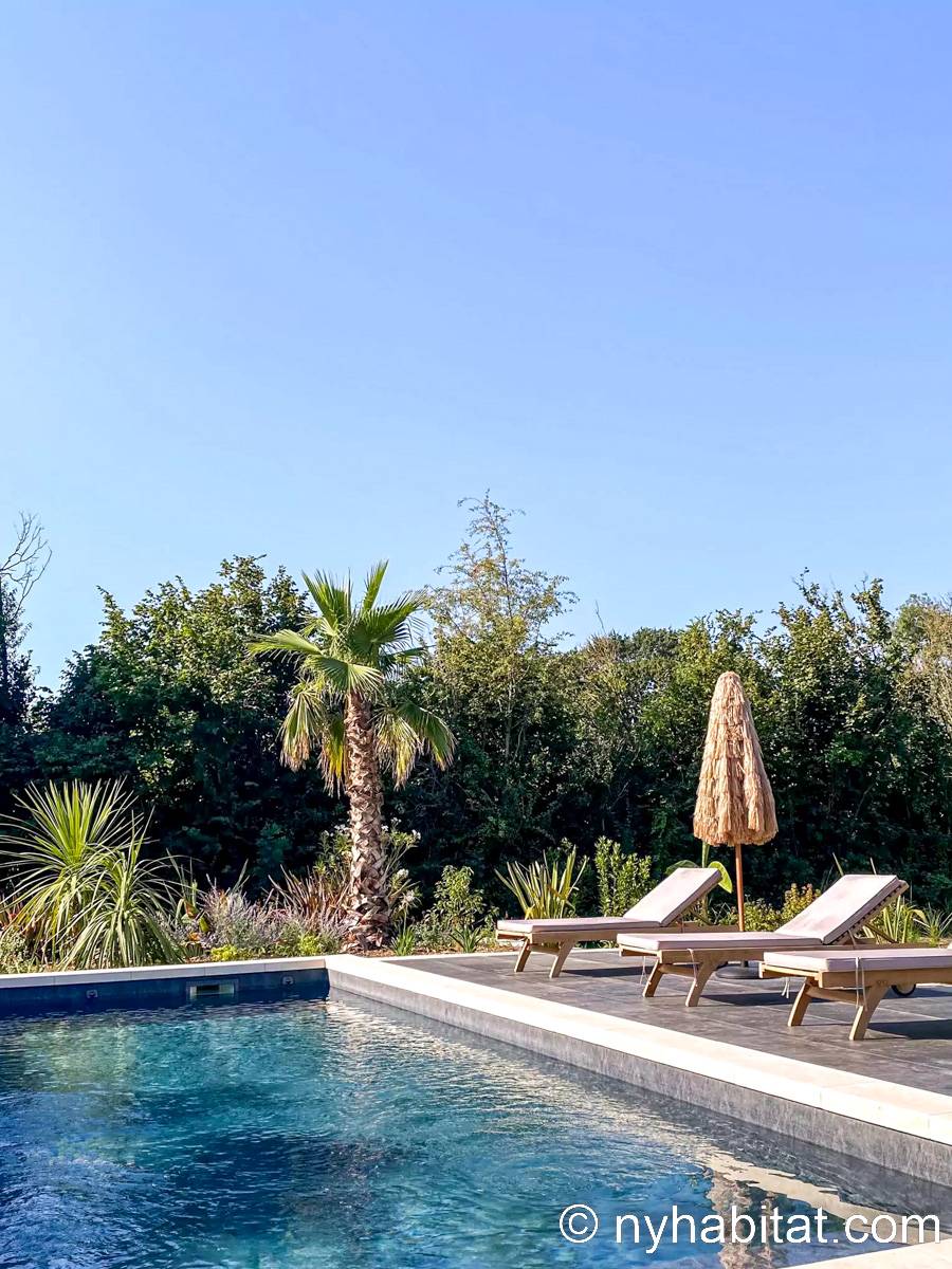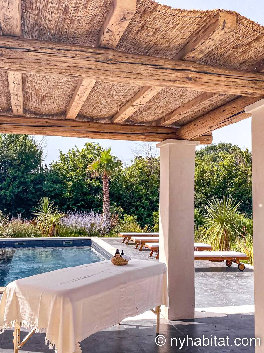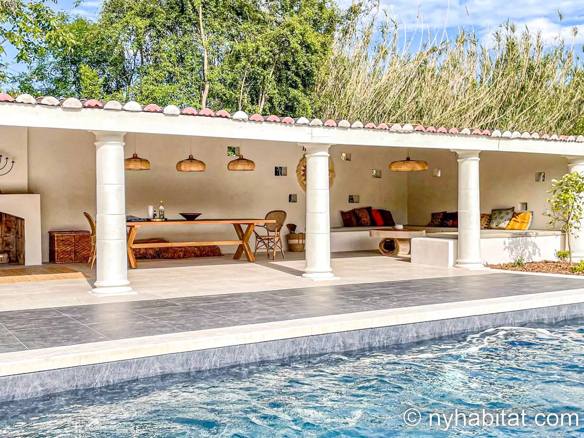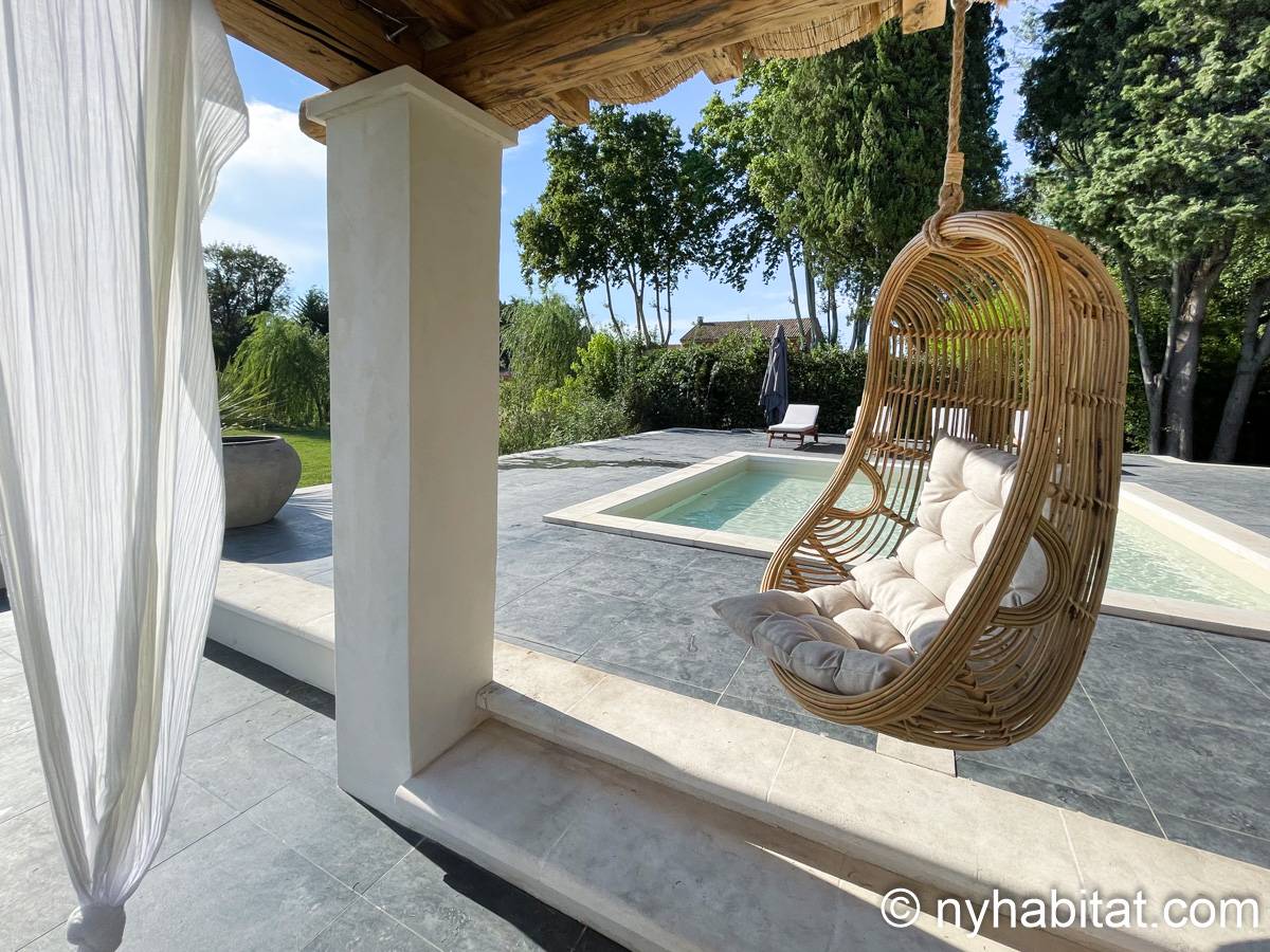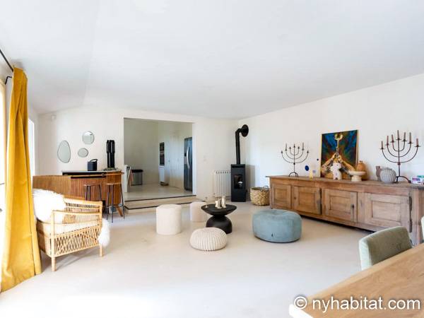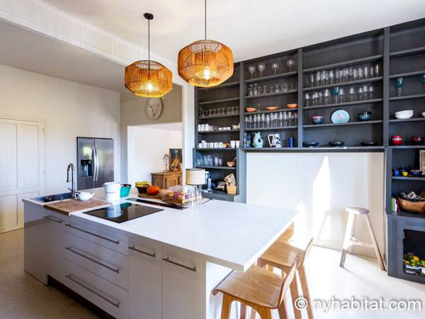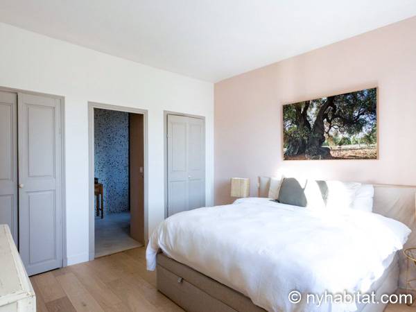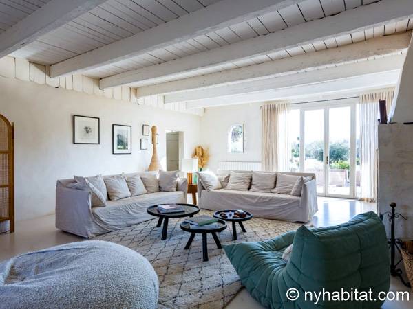 Authentic provincial details include lush greenery outside and exposed wooden beams inside. Floor-to-ceiling glass doors connect the outdoor area to a bright and airy living room in this short-term rental, which features a sofa and TV. This accommodation has a dining table. The separate kitchen (located next to the living room) features an oven, refrigerator, freezer, dishwasher, microwave, coffee maker, and a large island with bar seating. Three of the bedrooms feature king sized beds, and the others feature queen-, double-, and single-size beds. All of the bedrooms have air conditioning. Three out of the five bathrooms have showers, and the other two have tubs. Four of the bathrooms are equipped with toilets. This space has a large outdoor table for meals as well as multiple sitting areas both away from and next to the swimming pool.