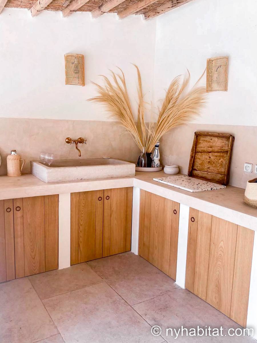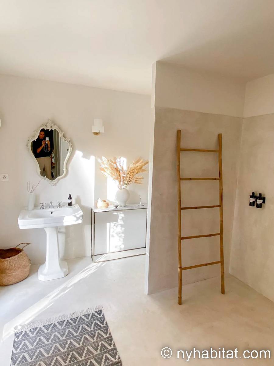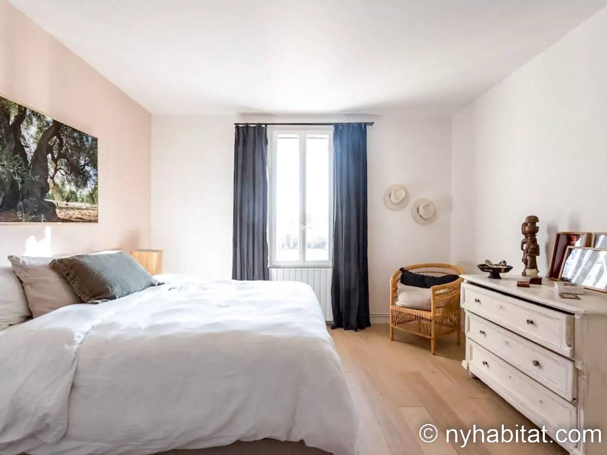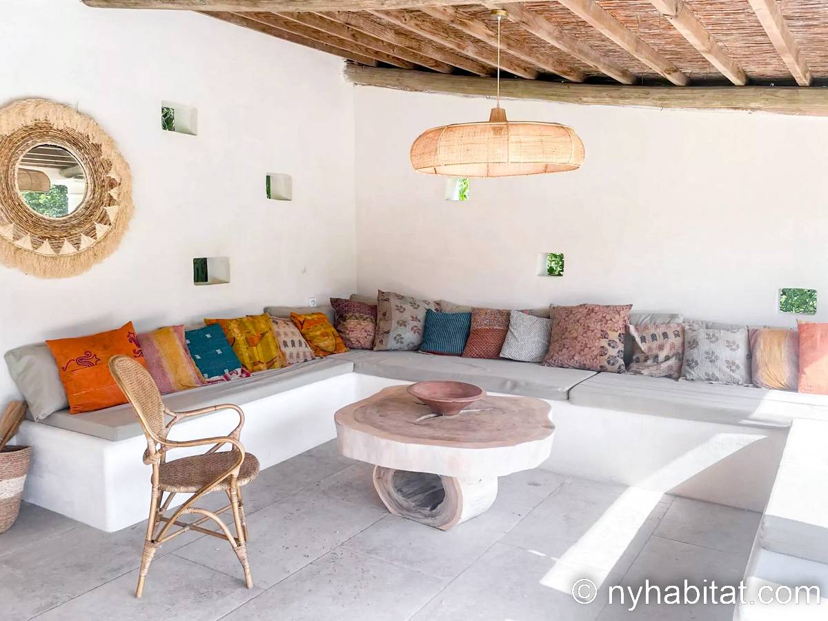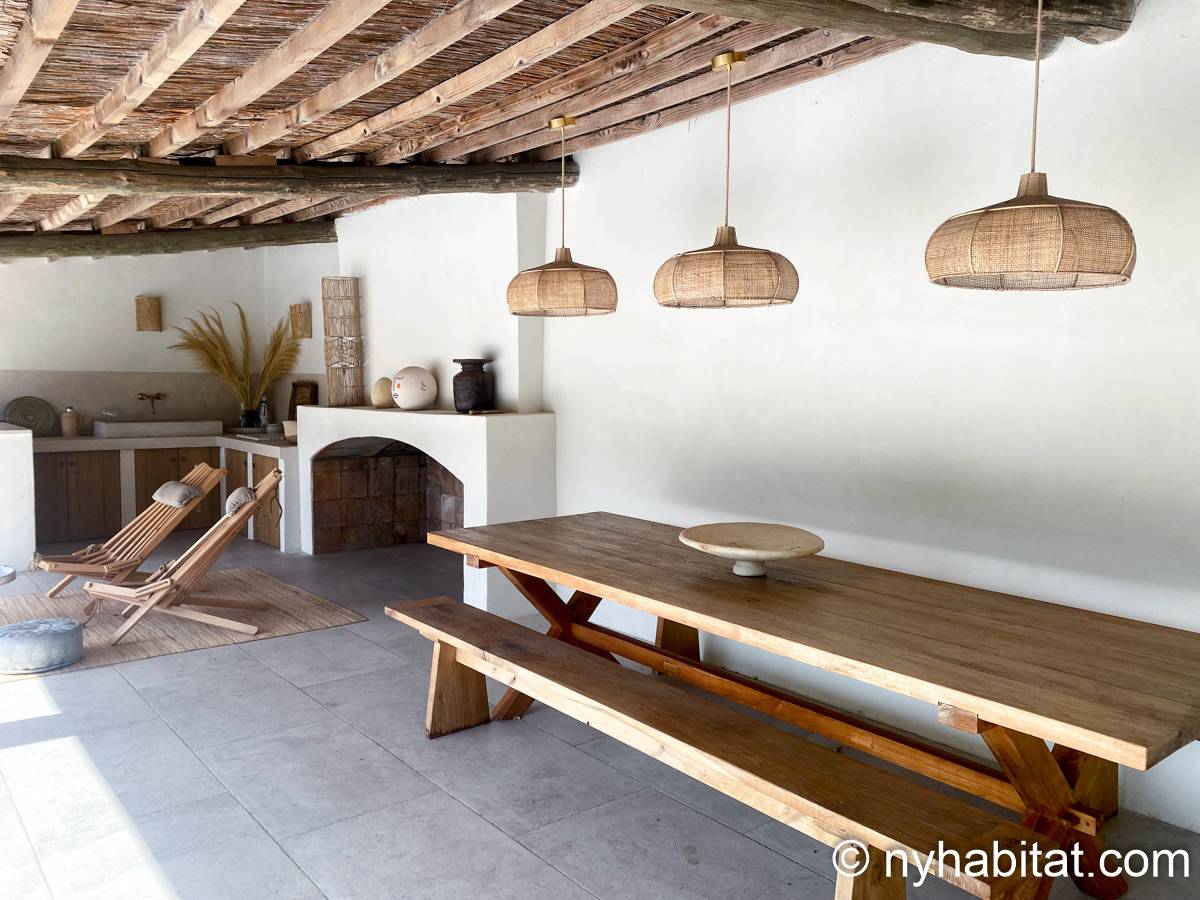 Authentic provincial details include lush greenery outside and exposed wooden beams inside. Floor-to-ceiling glass doors connect the outdoor area to a bright and airy living room in this short-term rental, which features a sofa and TV. This accommodation has a dining table. The separate kitchen (located next to the living room) features an oven, refrigerator, freezer, dishwasher, microwave, coffee maker, and a large island with bar seating. Three of the bedrooms feature king sized beds, and the others feature queen-, double-, and single-size beds. All of the bedrooms have air conditioning. Three out of the five bathrooms have showers, and the other two have tubs. Four of the bathrooms are equipped with toilets. This space has a large outdoor table for meals as well as multiple sitting areas both away from and next to the swimming pool.