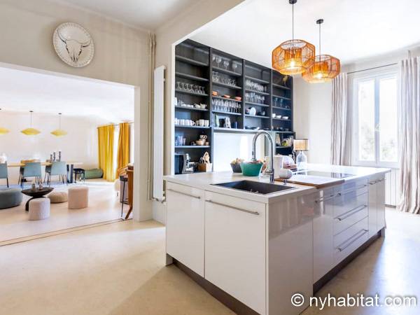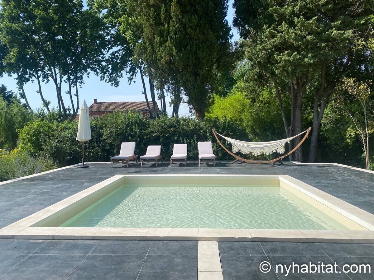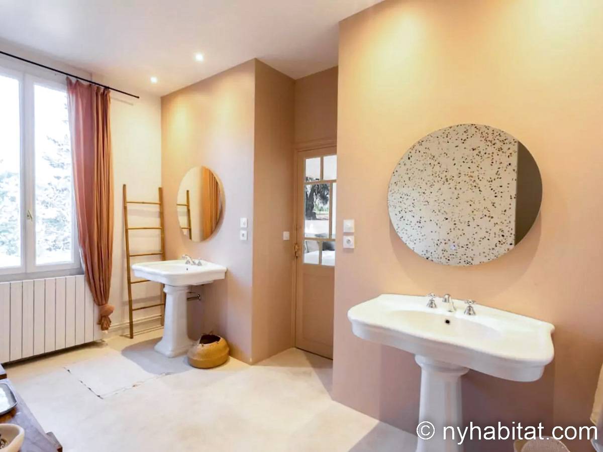 This vacation rental is a villa in Mollégès, Provence, at the intersection of Chemin des Carrairades and Route de Saint Rémy. This 6-bedroom, 5-bathroom accommodation takes up 380 m2 (around 4,000 square feet), a two-story house with a security system, pool, and garden. There is a washing machine and dryer in the accommodation.