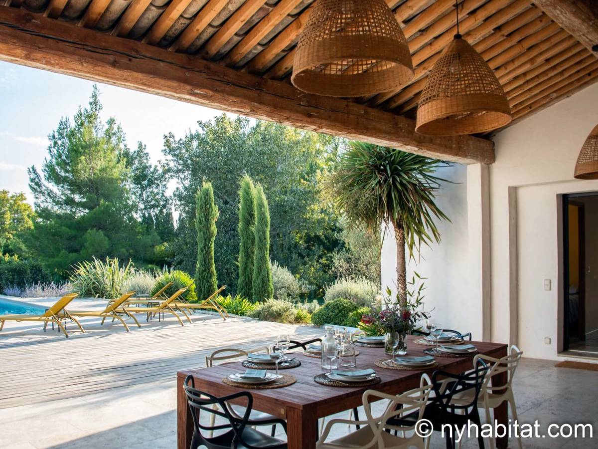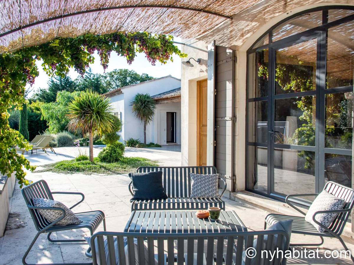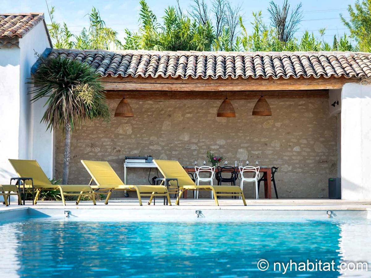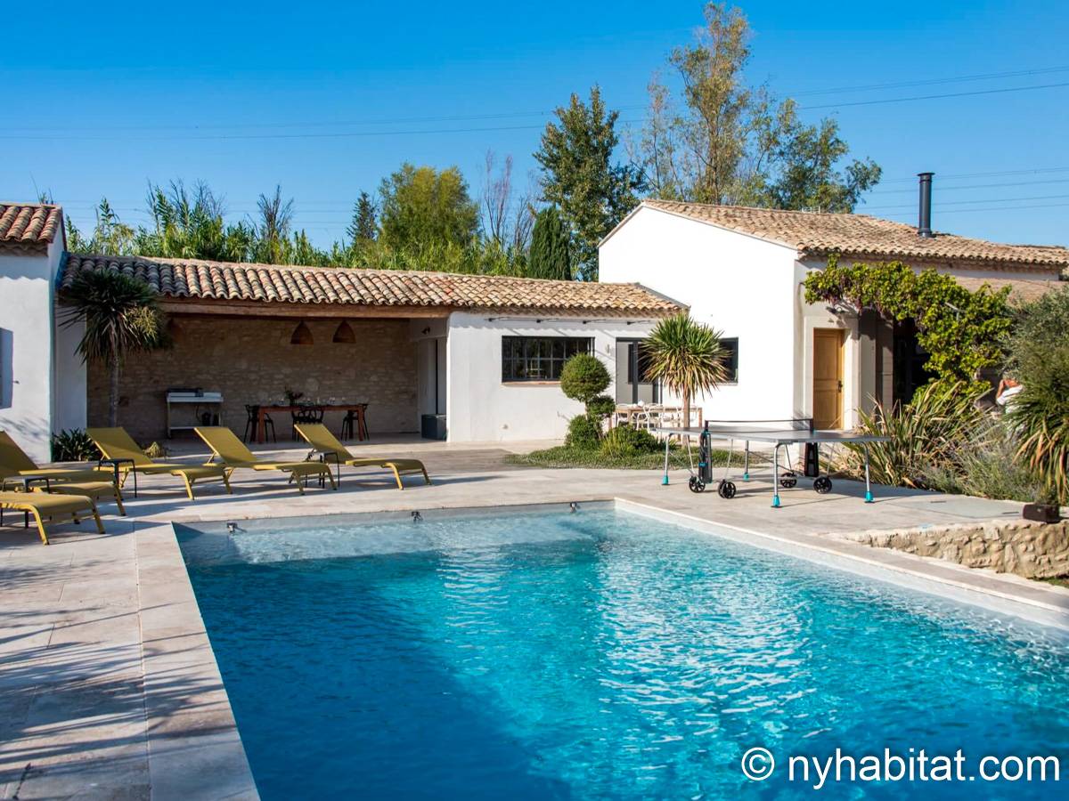 Welcome to this 6-bedroom, 3-bathroom vacation rental in Eyragues, Provence! This furnished vacation rental has a pool, terrace, garden, a washing machine, and a dryer. Located on a narrow road which slices through the countryside, Chemin de Saint Bonnet, this is a 240 m2 (around 2,600 square-foot) Mas.