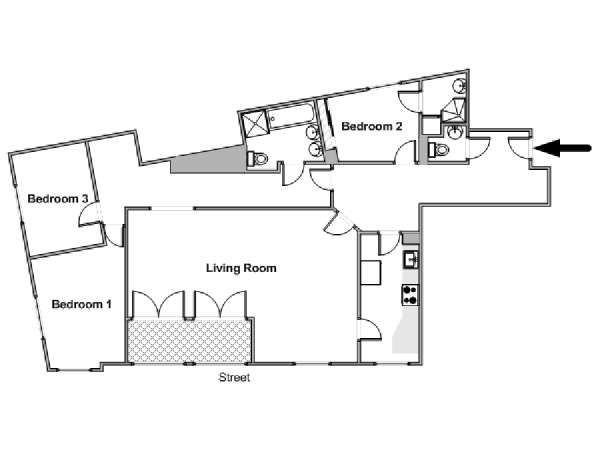 The living room offers air conditioning, a sofa, a TV, a dining area, a desk/workspace, and access to the balcony. The separate kitchen is equipped with an oven, a fridge, a freezer, a microwave, a toaster, and coffee machine, a dishwasher, an eating area, and granite-patterned countertops and backsplash. All three bedrooms provide a double-sized bed, with two of the bedrooms including a desk/workspace. Two of the bathrooms offer a walk-in shower and one also provides a separate bathtub.