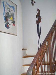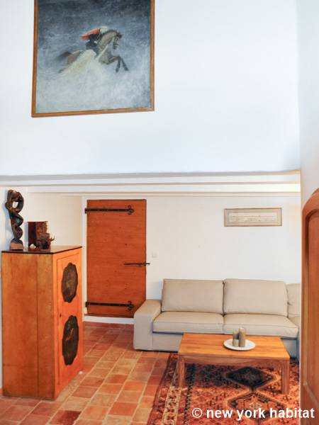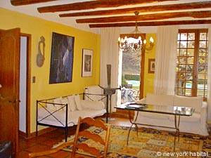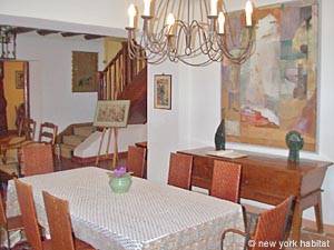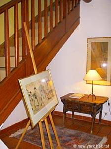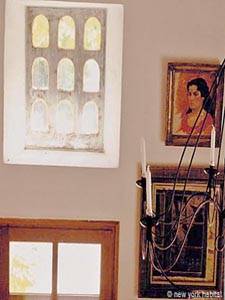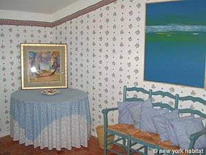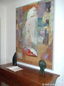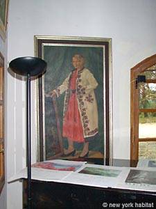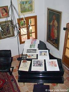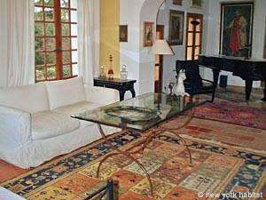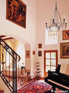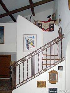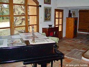 A pleasant sitting room with comfortable settees and concert piano gives onto the gardens. Art is omnipresent in the house with paintings and sculptures.