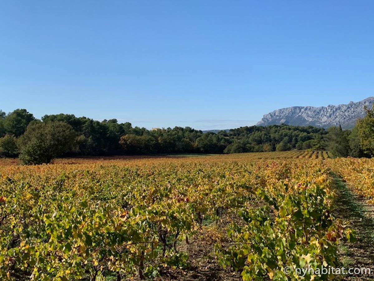 Sourrounded by a ten acre vineyard, the mas is nestled in a cosy hollow near Pourrieres and Trets. The small village of Pourrieres is at reasonable walking distance..