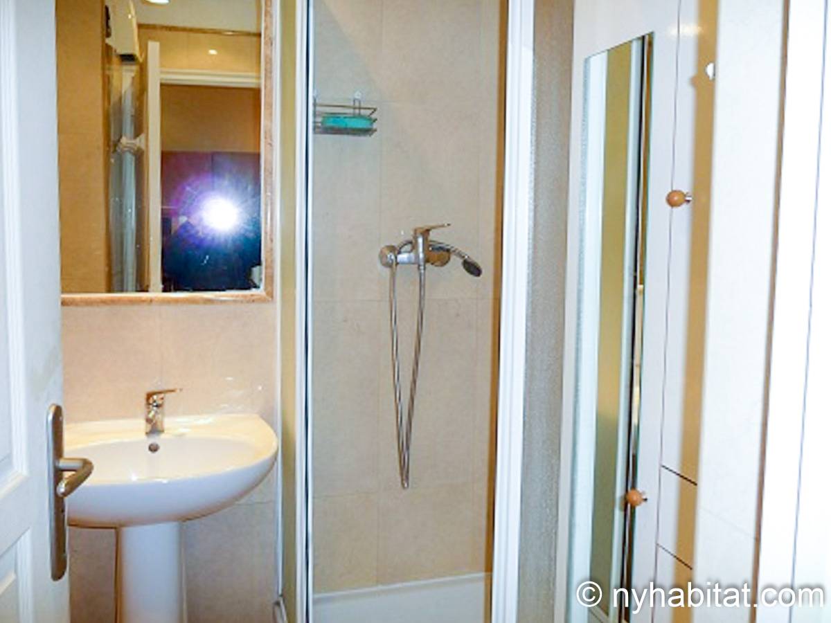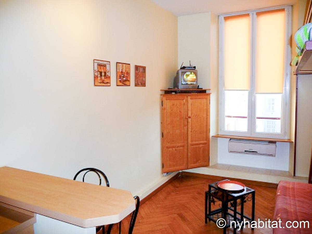 This South of France apartment features typical French decoration including a French window and herringbone hardwood flooring. The main room is a flexible space with a double sofa-bed and a small dining table. Relax by the TV, which has foreign channels, or enjoy the view out the window, which opens onto a courtyard and overlooks the city's rooftops.