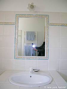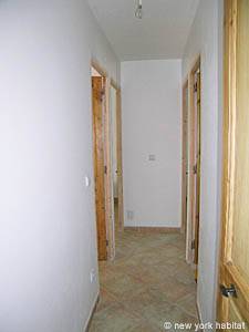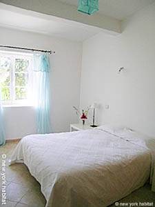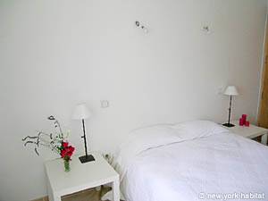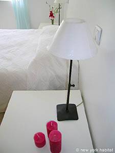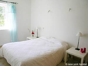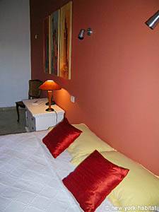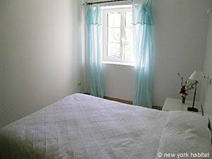 The second bedroom is furnished with a double bed and a small closet. There is a window facing south and an en-suite bathroom with a tub and a washbasin.