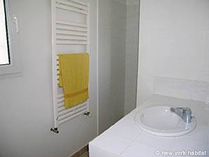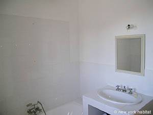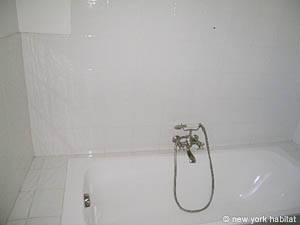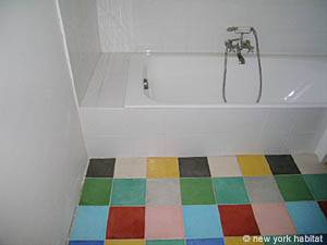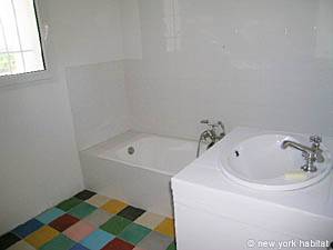 These bedrooms share a large bathroom with a washbasin and a tub.