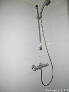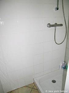 The first bedroom has a queen size bed with a chest of drawers. There is a window facing south and opening onto the garden. This bedroom has an en-suite bathroom with a stall shower .