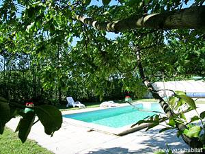 The garden is planted with trees and lawn. The pool (with security fence) is located at the end of the garden in a very private environment.