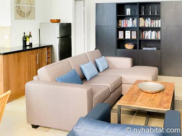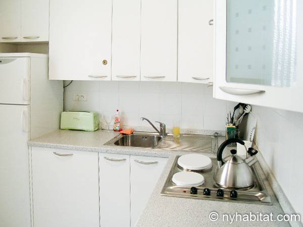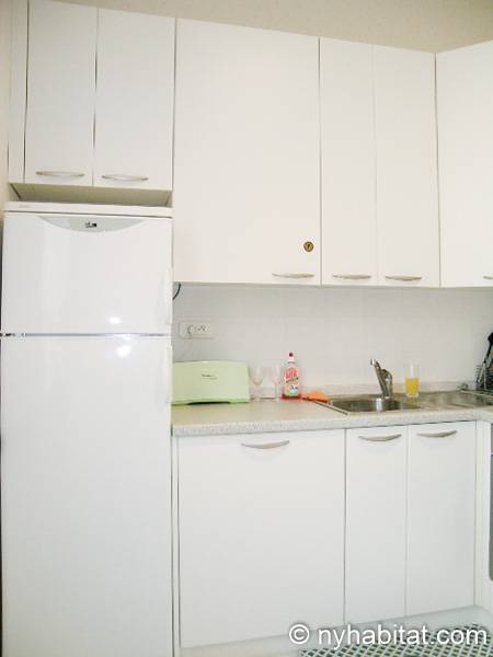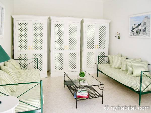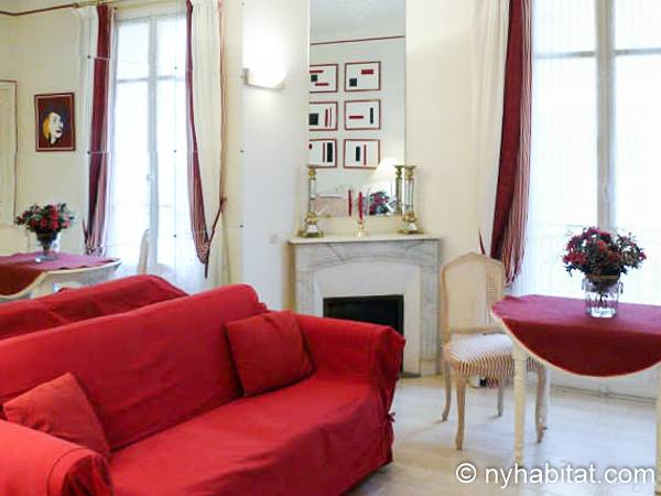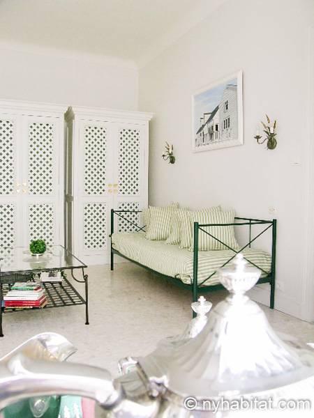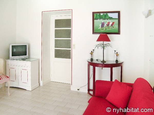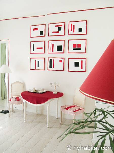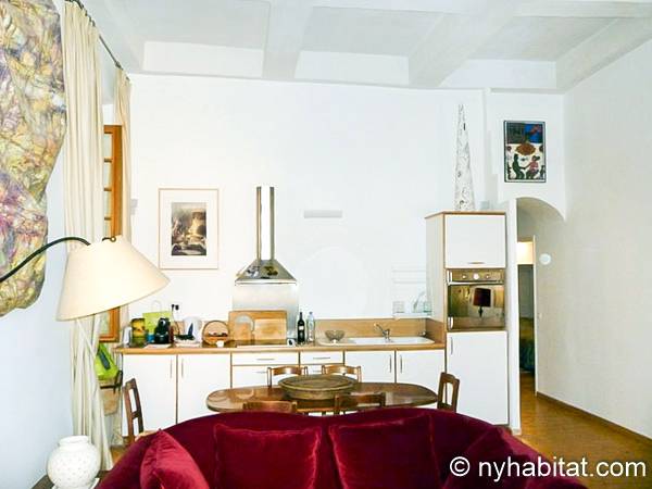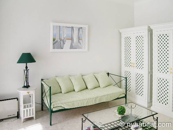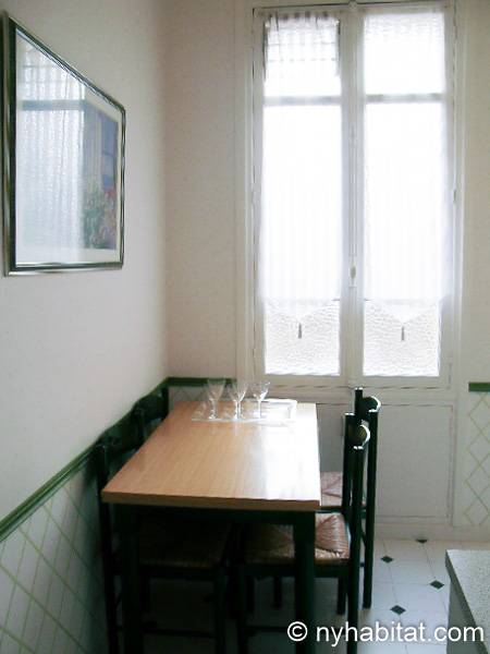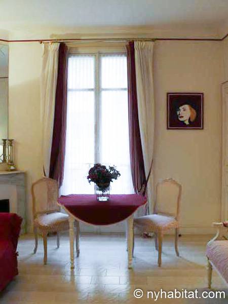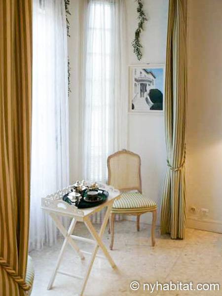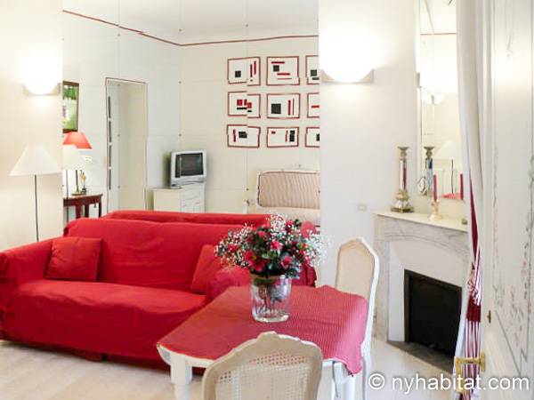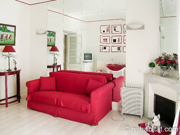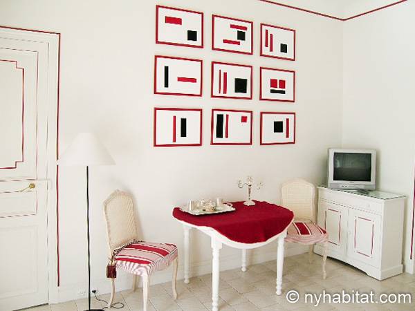 The living room is furnished with a double convertible sofa-bed, a round dining table seating 4 a cupboard and a TV. It is decorated by a large mirror. A window opens onto the street.