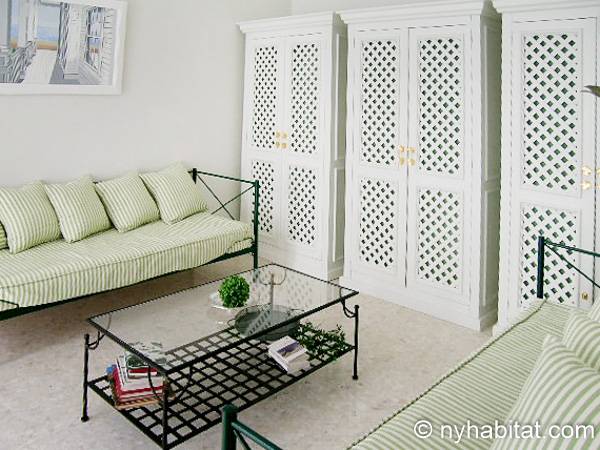 The second bedroom is off the living room and has a window opening onto the street. It is furnished with two single beds (also used as sofas), a coffee table and 3 wardrobes.